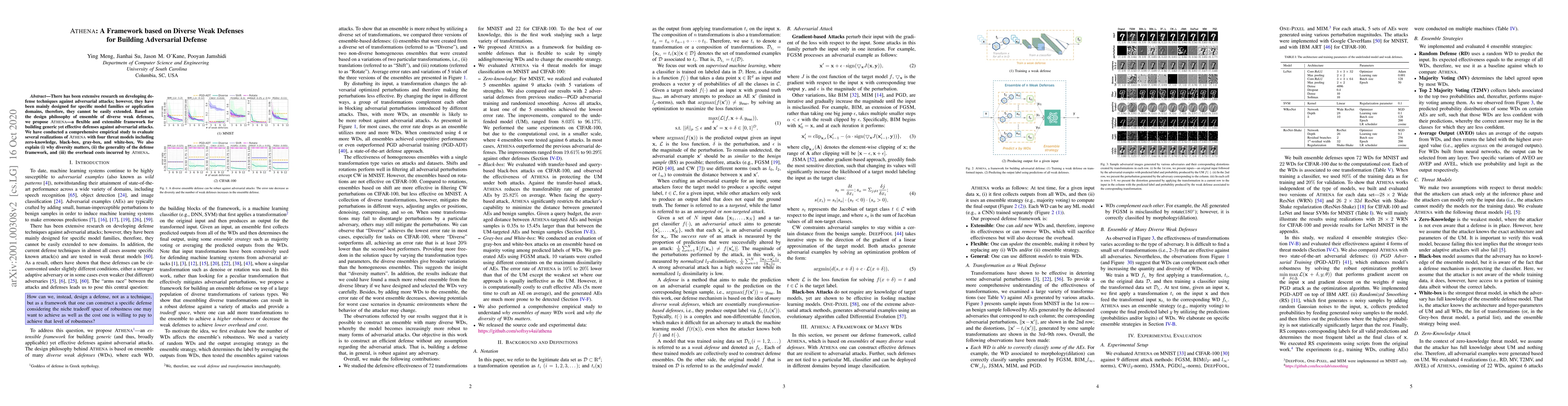 There has been extensive research on developing defense techniques against adversarial attacks; however, they have been mainly designed for specific model families or application domains, therefore, they cannot be easily extended. Based on the design philosophy of ensemble of diverse weak defenses, we propose ATHENA---a flexible and extensible framework for building generic yet effective defenses against adversarial attacks. We have conducted a comprehensive empirical study to evaluate several realizations of ATHENA with four threat models including zero-knowledge, black-box, gray-box, and white-box. We also explain (i) why diversity matters, (ii) the generality of the defense framework, and (iii) the overhead costs incurred by ATHENA.