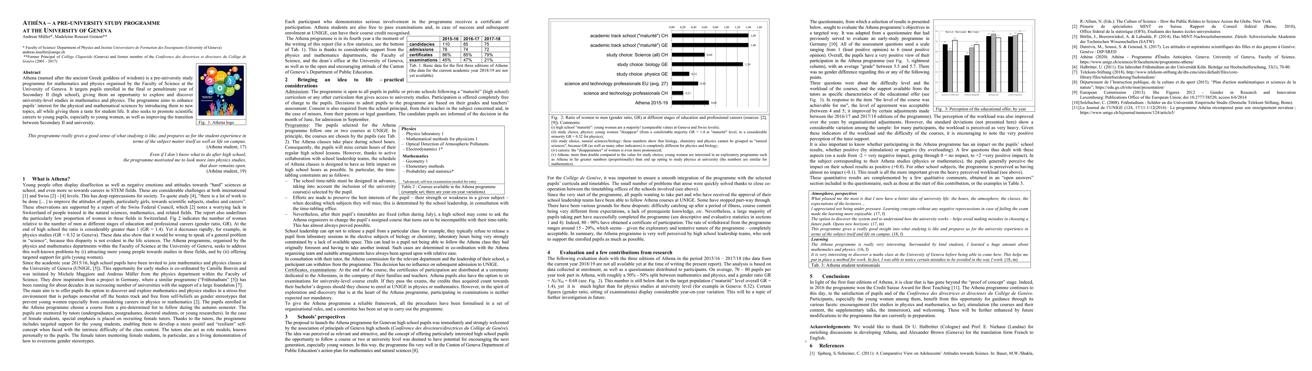 Athena (named after the ancient Greek goddess of wisdom) is a pre-university study programme for mathematics and physics organised by the Faculty of Science at the University of Geneva. It targets pupils enrolled in the final or penultimate year of Secondary II (high school), giving them an opportunity to explore and discover university-level studies in mathematics and physics. The programme aims to enhance pupils interest for the physical and mathematical sciences by introducing them to new topics, all while giving them a taste for student life. It also seeks to promote scientific careers to young pupils, especially to young women, as well as improving the transition between Secondary II and university