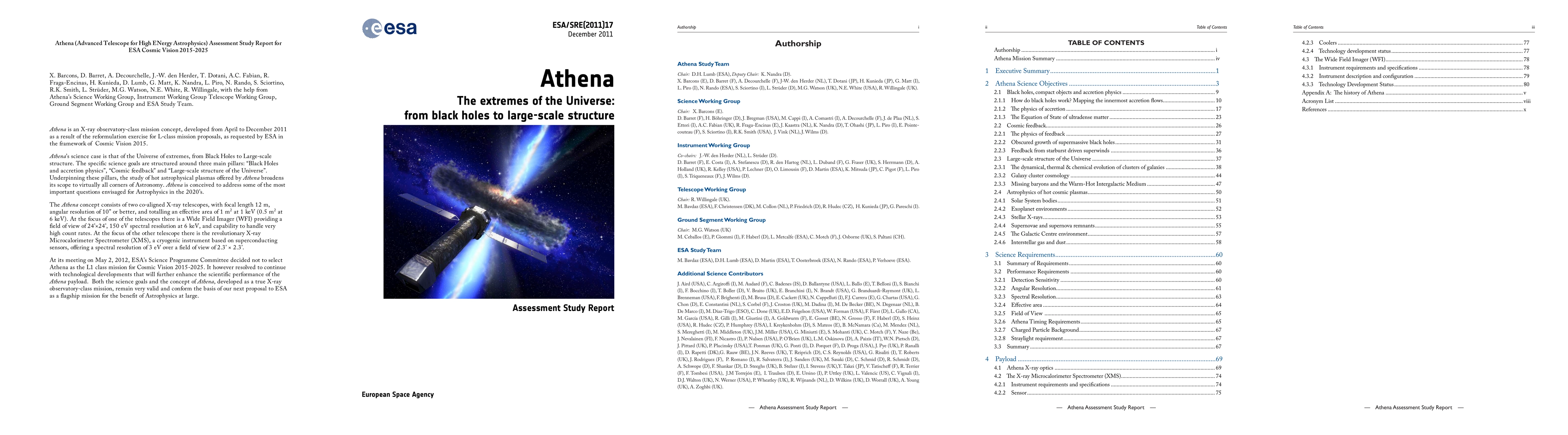 The Athena X-ray observatory mission concept, proposed for ESA's Cosmic Vision 2015-2025, aims to explore the Universe's extremes, focusing on black holes, cosmic feedback, and large-scale structure. Despite not being selected, its advanced telescopes and spectrometers remain foundational for future X-ray astronomy.