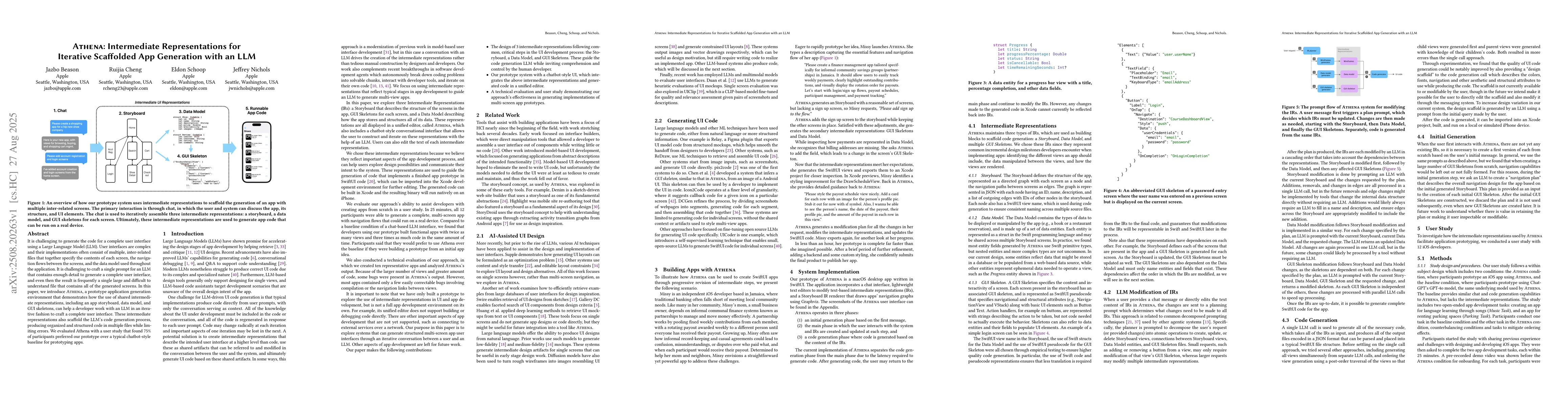 It is challenging to generate the code for a complete user interface using a Large Language Model (LLM). User interfaces are complex and their implementations often consist of multiple, inter-related files that together specify the contents of each screen, the navigation flows between the screens, and the data model used throughout the application. It is challenging to craft a single prompt for an LLM that contains enough detail to generate a complete user interface, and even then the result is frequently a single large and difficult to understand file that contains all of the generated screens. In this paper, we introduce Athena, a prototype application generation environment that demonstrates how the use of shared intermediate representations, including an app storyboard, data model, and GUI skeletons, can help a developer work with an LLM in an iterative fashion to craft a complete user interface. These intermediate representations also scaffold the LLM's code generation process, producing organized and structured code in multiple files while limiting errors. We evaluated Athena with a user study that found 75% of participants preferred our prototype over a typical chatbot-style baseline for prototyping apps.