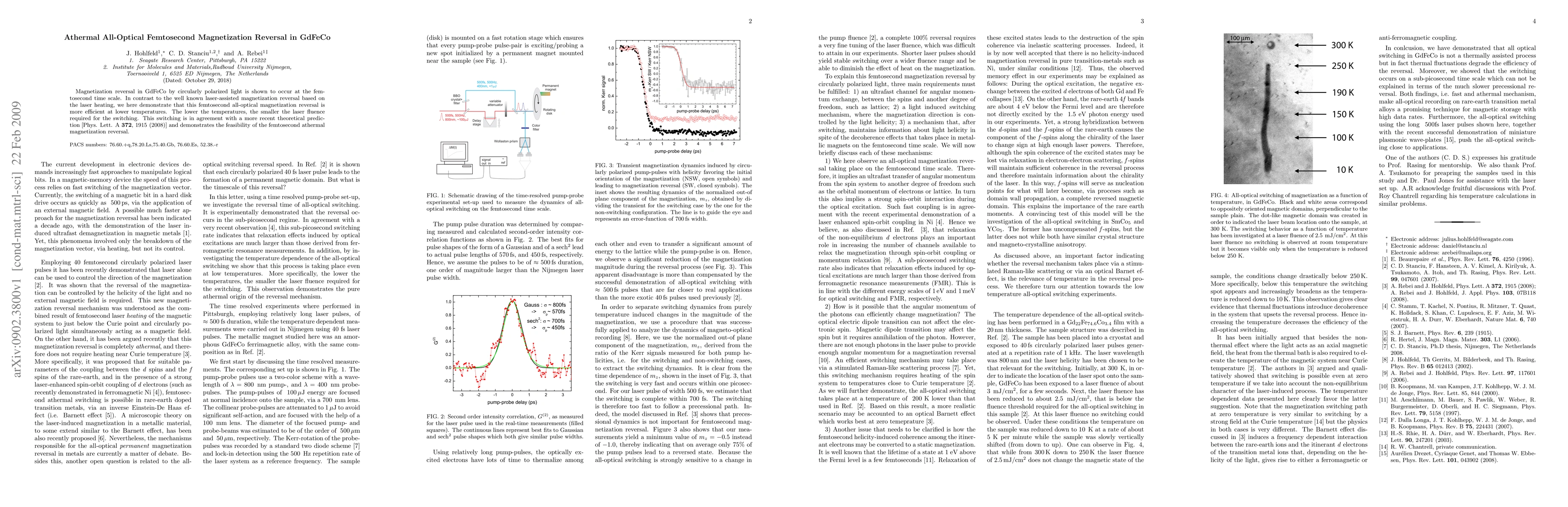 This paper demonstrates that GdFeCo can undergo femtosecond all-optical magnetization reversal via circularly polarized light, independent of thermal effects. The process is more efficient at lower temperatures, requiring less laser fluence for switching, which aligns with recent theoretical predictions.
