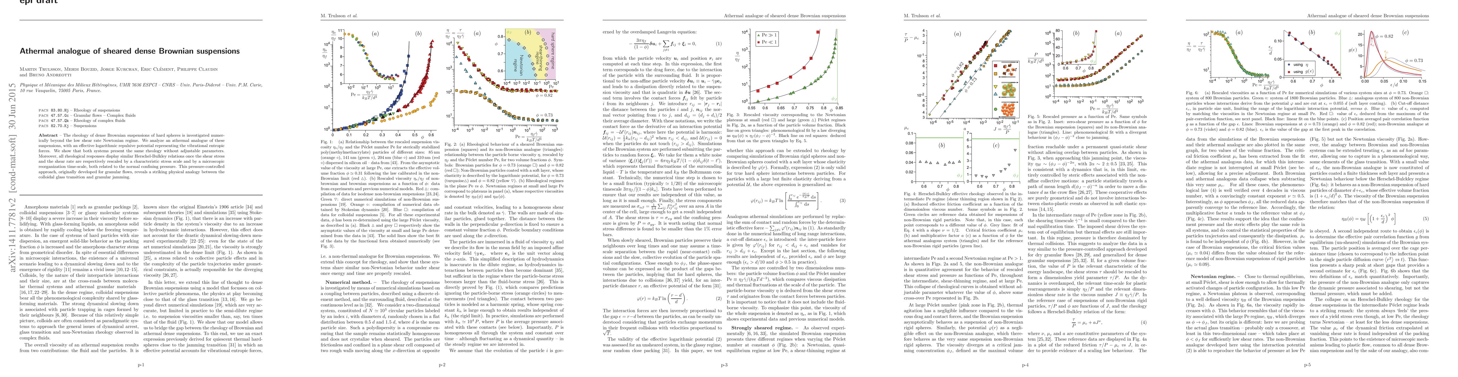 The paper introduces an athermal analogue of sheared dense Brownian suspensions using a logarithmic repulsive potential, enabling the comparison of rheological responses between Brownian and non-Brownian systems.
