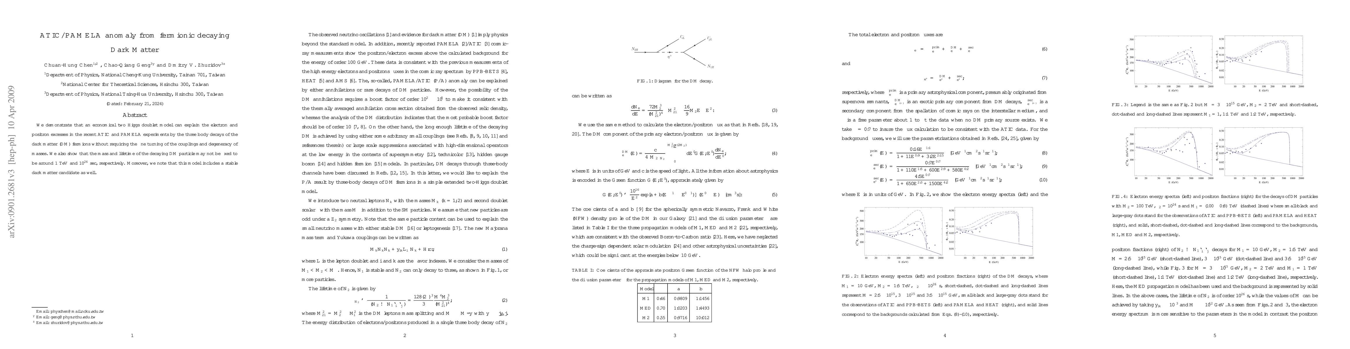 We demonstrate that an economical two Higgs doublet model can explain the electron and positron excesses in the recent ATIC and PAMELA experiments by the three body decays of the dark matter (DM) fermions without requiring the fine turning of the couplings and degeneracy of masses. We also show that the mass and lifetime of the decaying DM particle may not be fixed to be around 1 TeV and 10^{26} sec, respectively. Moreover, we note that this model includes a stable dark matter candidate as well.