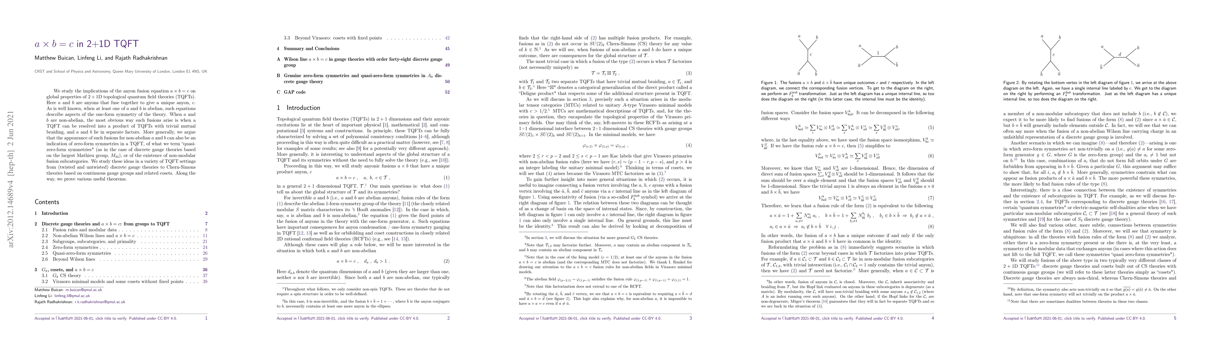 We study the implications of the anyon fusion equation $a\times b=c$ on global properties of $2+1$D topological quantum field theories (TQFTs). Here $a$ and $b$ are anyons that fuse together to give a unique anyon, $c$. As is well known, when at least one of $a$ and $b$ is abelian, such equations describe aspects of the one-form symmetry of the theory. When $a$ and $b$ are non-abelian, the most obvious way such fusions arise is when a TQFT can be resolved into a product of TQFTs with trivial mutual braiding, and $a$ and $b$ lie in separate factors. More generally, we argue that the appearance of such fusions for non-abelian $a$ and $b$ can also be an indication of zero-form symmetries in a TQFT, of what we term "quasi-zero-form symmetries" (as in the case of discrete gauge theories based on the largest Mathieu group, $M_{24}$), or of the existence of non-modular fusion subcategories. We study these ideas in a variety of TQFT settings from (twisted and untwisted) discrete gauge theories to Chern-Simons theories based on continuous gauge groups and related cosets. Along the way, we prove various useful theorems.