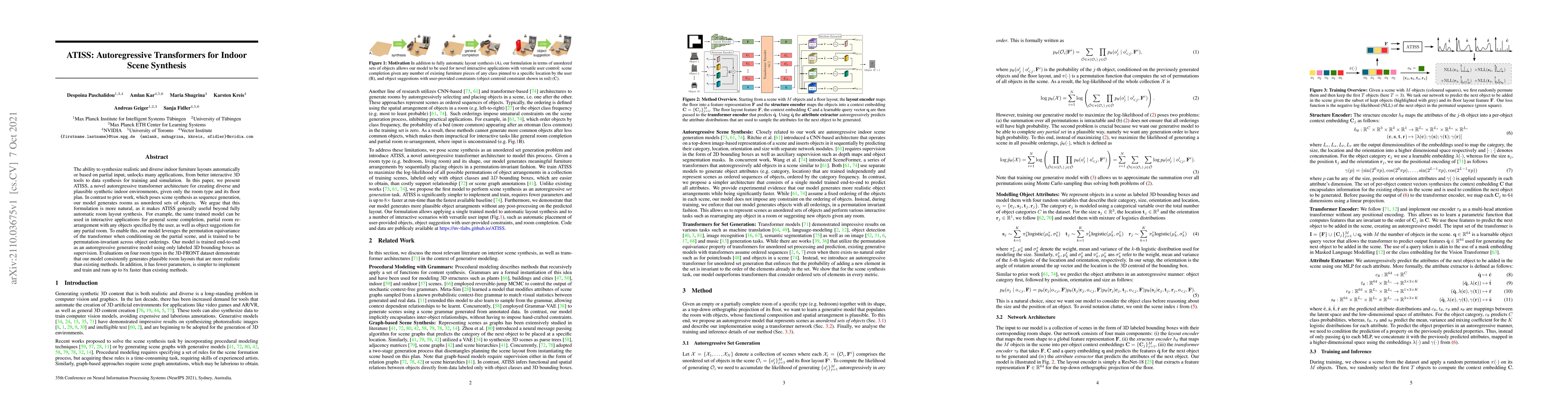 ATISS is an autoregressive transformer architecture designed for generating diverse and realistic indoor furniture layouts based on the room type and floor plan. It represents rooms as unordered sets of objects, enabling applications like interactive scene completion and partial room rearrangement.
