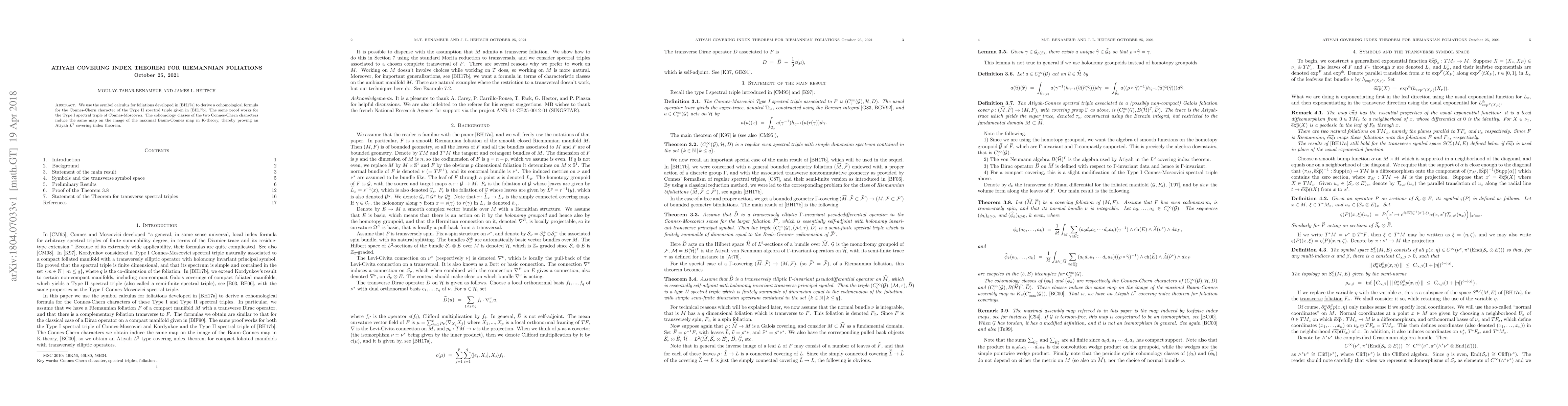 This paper derives a cohomological formula for the Connes-Chern character using symbol calculus for foliations, proving the Atiyah $L^2$ covering index theorem for Riemannian foliations and extending the proof to Connes-Moscovici's Type I spectral triple.
