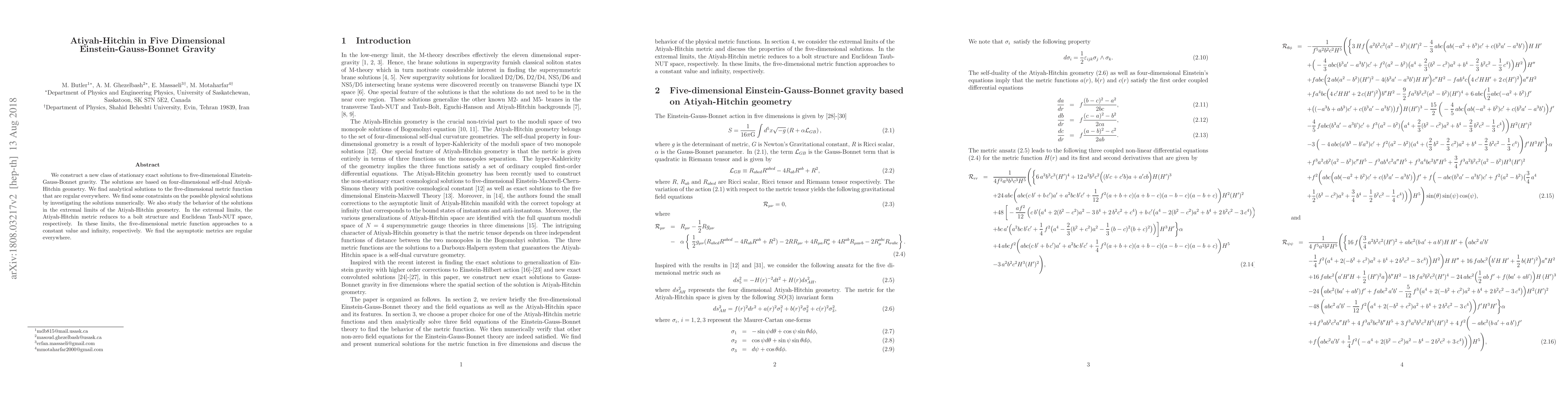 We construct a new class of stationary exact solutions to five-dimensional Einstein-Gauss-Bonnet gravity. The solutions are based on four-dimensional self-dual Atiyah-Hitchin geometry. We find analytical solutions to the five-dimensional metric function that are regular everywhere. We find some constraints on the possible physical solutions by investigating the solutions numerically. We also study the behavior of the solutions in the extremal limits of the Atiyah-Hitchin geometry. In the extremal limits, the Atiyah-Hitchin metric reduces to a bolt structure and Euclidean Taub-NUT space, respectively. In these limits, the five-dimensional metric function approaches to a constant value and infinity, respectively. We find the asymptotic metrics are regular everywhere.
