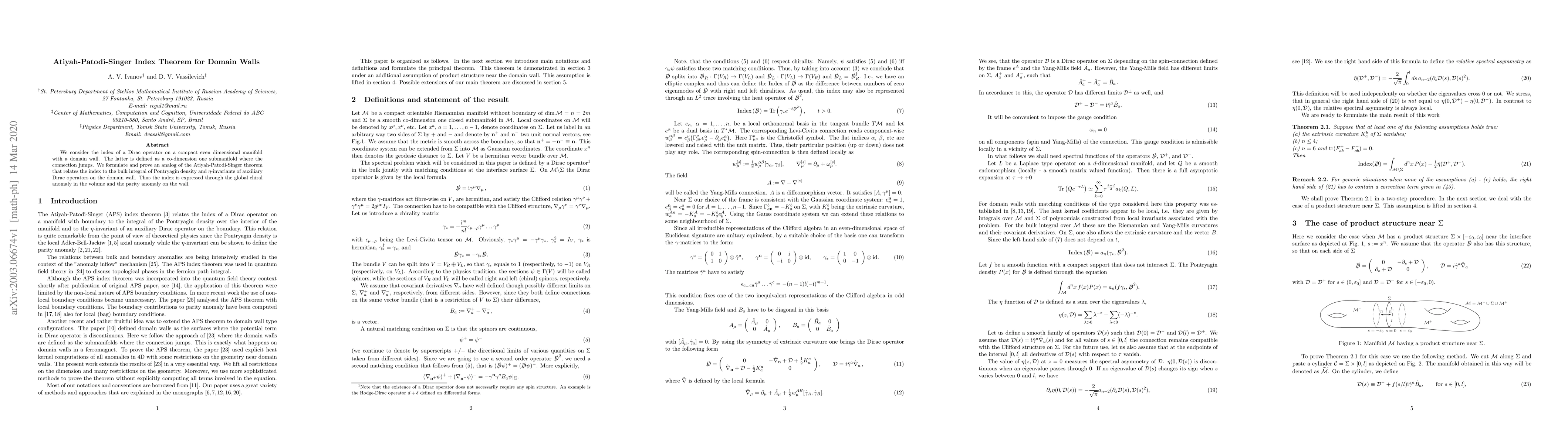 The paper formulates and proves an analog of the Atiyah-Patodi-Singer theorem for Dirac operators on manifolds with domain walls, linking the index to the bulk's Pontryagin density and the wall's $\eta$-invariants, expressing it via global and parity anomalies.