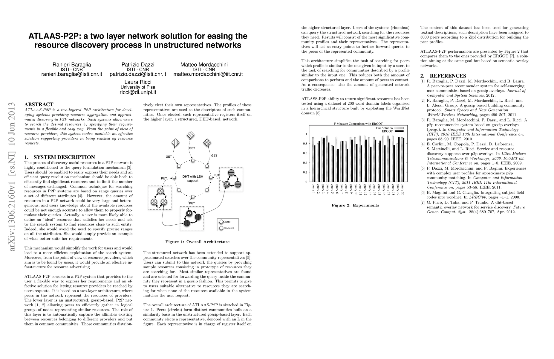 ATLAAS-P2P is a two-layered P2P architecture for developing systems providing resource aggregation and approximated discovery in P2P networks. Such systems allow users to search the desired resources by specifying their requirements in a flexible and easy way. From the point of view of resource providers, this system makes available an effective solution supporting providers in being reached by resource requests.