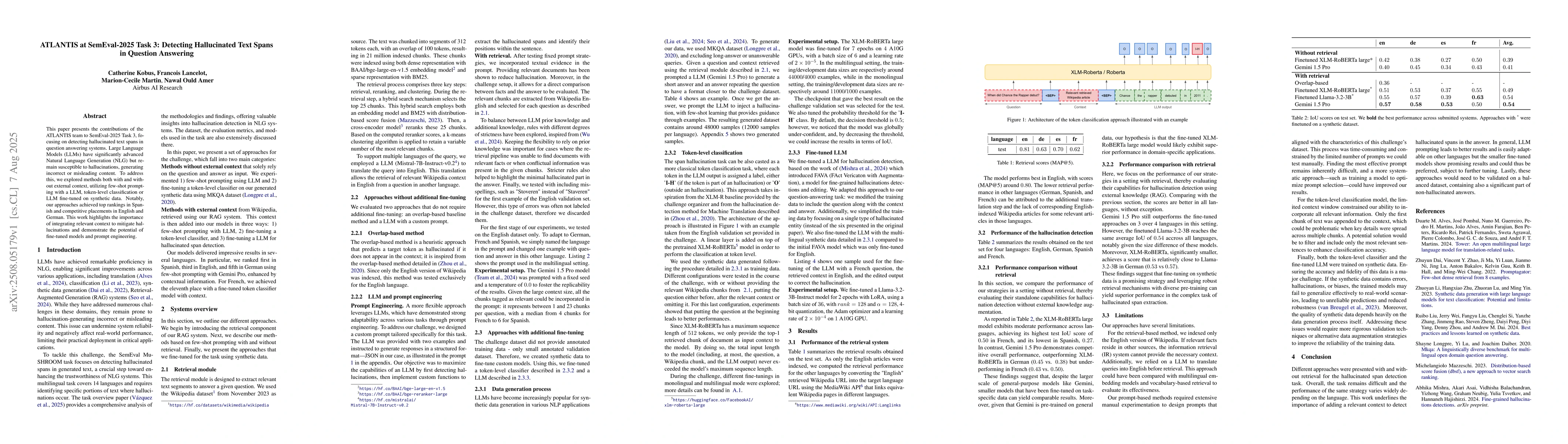 This paper presents the contributions of the ATLANTIS team to SemEval-2025 Task 3, focusing on detecting hallucinated text spans in question answering systems. Large Language Models (LLMs) have significantly advanced Natural Language Generation (NLG) but remain susceptible to hallucinations, generating incorrect or misleading content. To address this, we explored methods both with and without external context, utilizing few-shot prompting with a LLM, token-level classification or LLM fine-tuned on synthetic data. Notably, our approaches achieved top rankings in Spanish and competitive placements in English and German. This work highlights the importance of integrating relevant context to mitigate hallucinations and demonstrate the potential of fine-tuned models and prompt engineering.