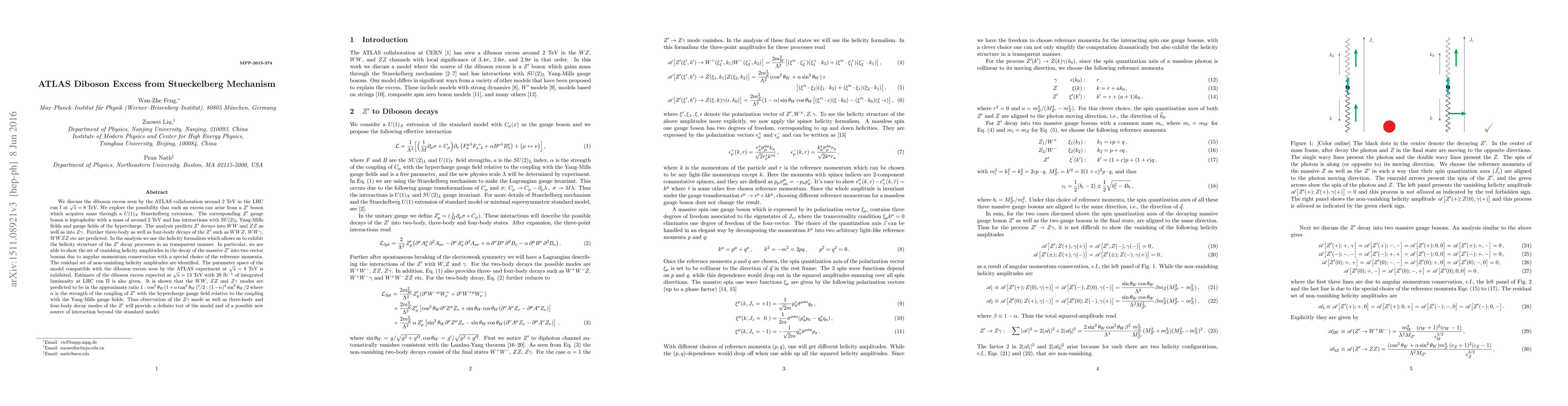 We discuss the diboson excess seen by the ATLAS detector around 2 TeV in the LHC run I at $\sqrt{s}=8$ TeV. We explore the possibility that such an excess can arise from a $Z'$ boson which acquires mass through a $U(1)_X$ Stueckelberg extension. The corresponding $Z'$ gauge boson is leptophobic with a mass of around 2 TeV and has interactions with $SU(2)_L$ Yang-Mills fields and gauge fields of the hypercharge. The analysis predicts $Z'$ decays into $WW$ and $ZZ$ as well as into $Z\gamma$. Further three-body as well as four-body decays of the $Z'$ such as $WWZ, WW\gamma, WWZZ$ etc are predicted. In the analysis we use the helicity formalism which allows us to exhibit the helicity structure of the $Z'$ decay processes in an transparent manner. In particular, we are able to show the set of vanishing helicity amplitudes in the decay of the massive $Z'$ into two vector bosons due to angular momentum conservation with a special choice of the reference momenta. The residual set of non-vanishing helicity amplitudes are identified. The parameter space of the model compatible with the diboson excess seen by the ATLAS experiment at $\sqrt s=8$ TeV is exhibited. Estimate of the diboson excess expected at $\sqrt s= 13$ TeV with 20 fb$^{-1}$ of integrated luminosity at LHC run II is also given. It is shown that the $WW$, $ZZ$ and $Z\gamma$ modes are predicted to be in the approximate ratio $1:\cos^2\theta_W (1+ \alpha \tan^2\theta_W)^2/2: (1-\alpha)^2\sin^2\theta_W/2$ where $\alpha$ is the relative strength of the couplings of hypercharge gauge fields to the couplings of the Yang-Mills gauge fields. Thus observation of the $Z\gamma$ mode as well as three-body and four-body decay modes of the $Z'$ will provide a definite test of the model and of a possible new source of interaction beyond the standard model.