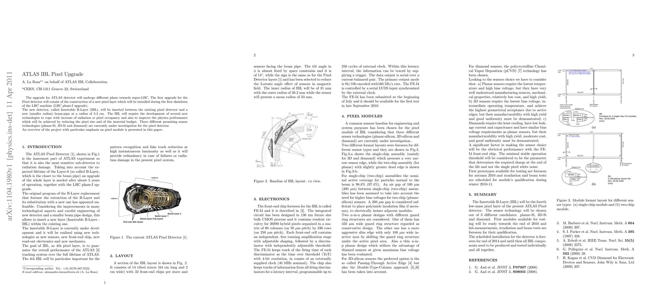 The ATLAS IBL Pixel Upgrade introduces a new Insertable B-Layer (IBL) between the existing pixel detector and a smaller beam-pipe, aiming to enhance physics performance and manage radiation and occupancy. Three sensor technologies—planar-Si, 3D-Si, and diamond—are being evaluated for this upgrade.