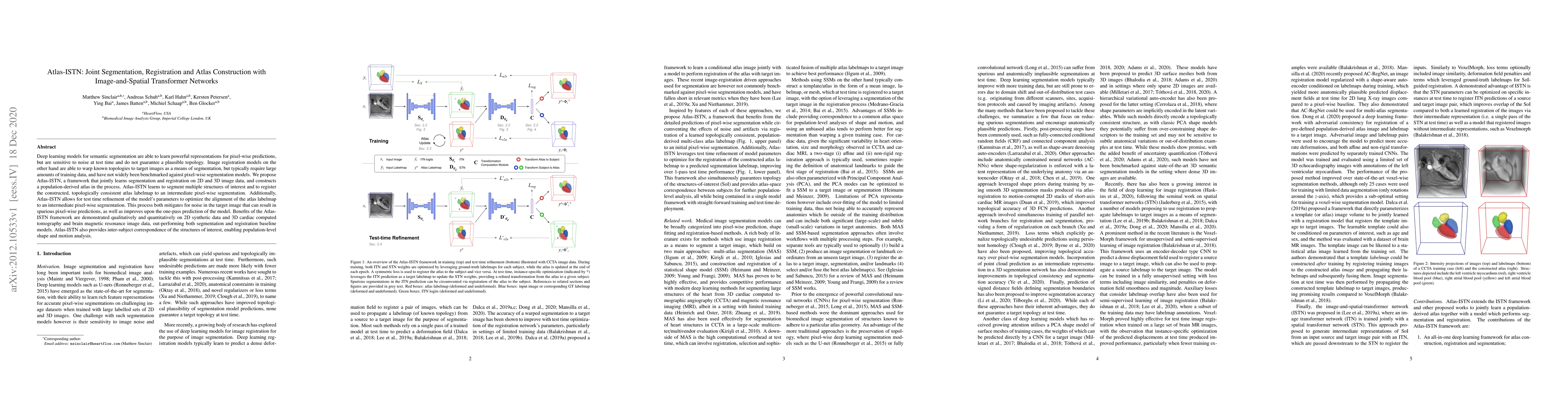 Deep learning models for semantic segmentation are able to learn powerful representations for pixel-wise predictions, but are sensitive to noise at test time and do not guarantee a plausible topology. Image registration models on the other hand are able to warp known topologies to target images as a means of segmentation, but typically require large amounts of training data, and have not widely been benchmarked against pixel-wise segmentation models. We propose Atlas-ISTN, a framework that jointly learns segmentation and registration on 2D and 3D image data, and constructs a population-derived atlas in the process. Atlas-ISTN learns to segment multiple structures of interest and to register the constructed, topologically consistent atlas labelmap to an intermediate pixel-wise segmentation. Additionally, Atlas-ISTN allows for test time refinement of the model's parameters to optimize the alignment of the atlas labelmap to an intermediate pixel-wise segmentation. This process both mitigates for noise in the target image that can result in spurious pixel-wise predictions, as well as improves upon the one-pass prediction of the model. Benefits of the Atlas-ISTN framework are demonstrated qualitatively and quantitatively on 2D synthetic data and 3D cardiac computed tomography and brain magnetic resonance image data, out-performing both segmentation and registration baseline models. Atlas-ISTN also provides inter-subject correspondence of the structures of interest, enabling population-level shape and motion analysis.