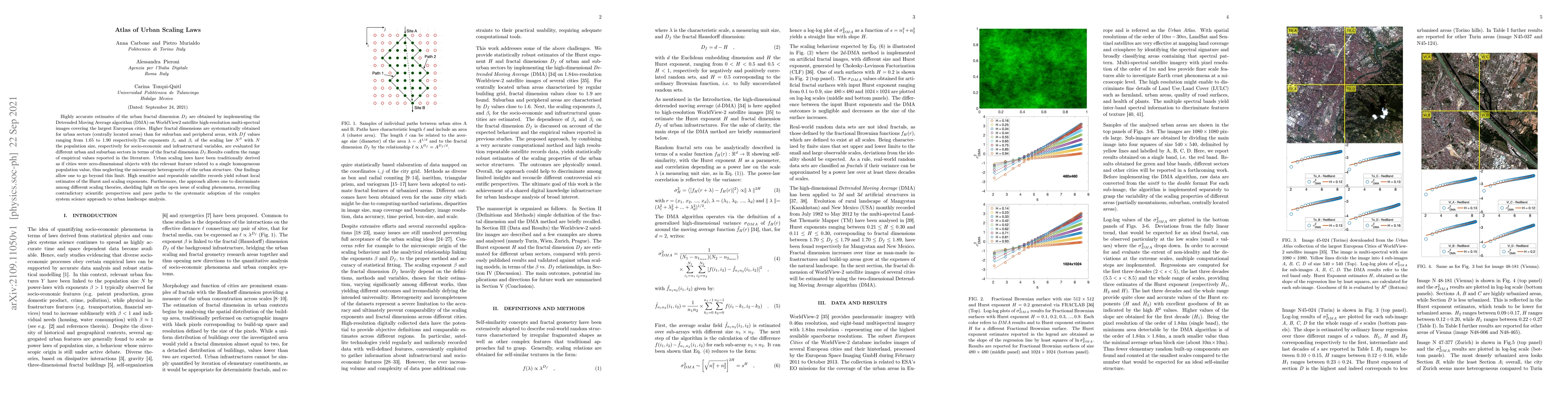Highly accurate estimates of the urban fractal dimension $D_f$ are obtained by implementing the Detrended Moving Average algorithm (DMA) on WorldView2 satellite high-resolution multi-spectral images covering the largest European cities. Higher fractal dimensions are systematically obtained for urban sectors (centrally located areas) than for suburban and peripheral areas, with $Df$ values ranging from $1.65$ to $1.90$ respectively.The exponents $\beta_s$ and $\beta_i$ of the scaling law $N^{\beta}$ with $N$ the population size, respectively for socio-economic and infrastructural variables, are evaluated for different urban and suburban sectors in terms of the fractal dimension $D_f$.Results confirm the range of empirical values reported in the literature. Urban scaling laws have been traditionally derived as if cities were zero-dimensional objects with the relevant feature related to a single homogeneous population value, thus neglecting the microscopic heterogeneity of the urban structure. Our findings allow one to go beyond this limit. High sensitive and repeatable satellite records yield robust local estimates of the Hurst and scaling exponents. Furthermore, the approach allows one to discriminate among different scaling theories, shedding light on the open issue of scaling phenomena, reconciling contradictory scientific perspectives and pave paths to the systematic adoption of the complex system science approach to urban landscape analysis.