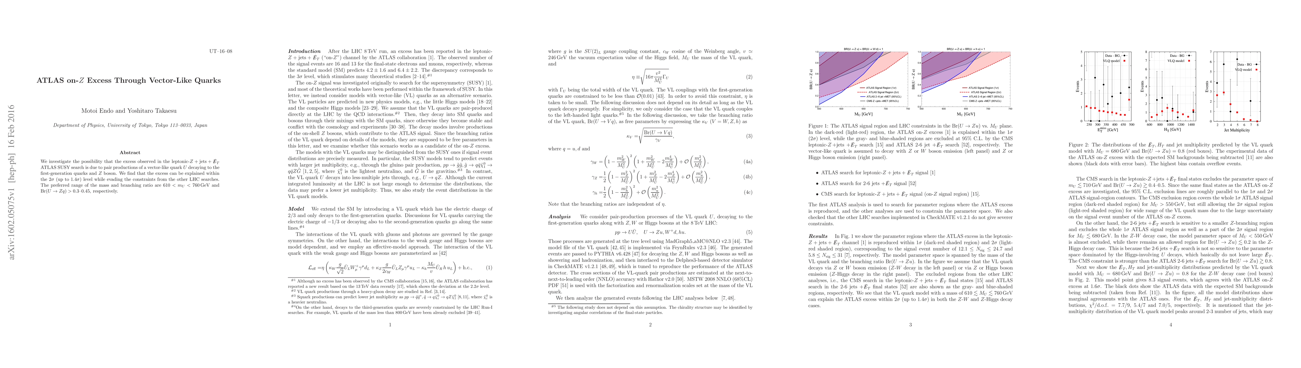 We investigate the possibility that the excess observed in the leptonic-$Z +$jets $+\slashed{E}_T$ ATLAS SUSY search is due to pair productions of a vector-like quark $U$ decaying to the first-generation quarks and $Z$ boson. We find that the excess can be explained within the 2$\sigma$ (up to 1.4$\sigma$) level while evading the constraints from the other LHC searches. The preferred range of the mass and branching ratio are $610 < m_{U} < 760$ GeV and ${\rm Br}(U \rightarrow Z q) > 0.3$-$0.45$, respectively.