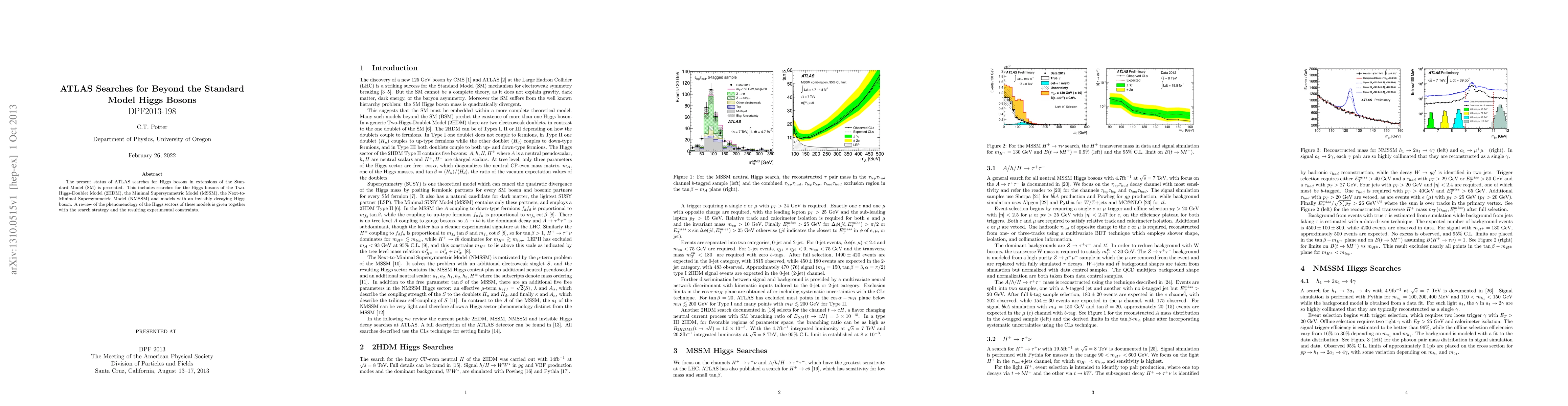 This paper reviews ATLAS's search for Higgs bosons beyond the Standard Model, focusing on the Two-Higgs-Doublet Model, Minimal Supersymmetric Model, Next-to-Minimal Supersymmetric Model, and models with invisible Higgs decays, detailing the phenomenology, search strategies, and experimental constraints derived from these investigations.