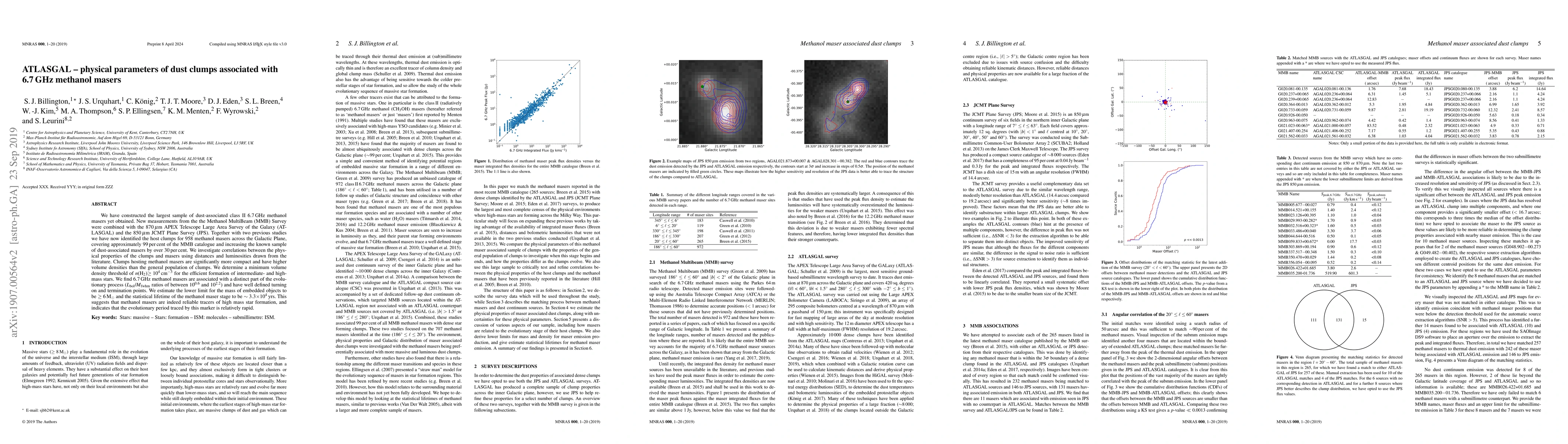 We have constructed the largest sample of dust-associated class II 6.7 GHz methanol masers yet obtained. New measurements from the the Methanol MultiBeam (MMB) Survey were combined with the 870 $\mu$m APEX Telescope Large Area Survey of the Galaxy (ATLASGAL) and the 850 $\mu$m JCMT Plane Survey (JPS). Together with two previous studies we have now identified the host clumps for 958 methanol masers across the Galactic Plane, covering approximately 99% of the MMB catalogue and increasing the known sample of dust-associated masers by over 30%. We investigate correlations between the physical properties of the clumps and masers using distances and luminosities drawn from the literature. Clumps hosting methanol masers are significantly more compact and have higher volume densities than the general population of clumps. We determine a minimum volume density threshold of $n$(H$_2$) $\geq 10^4$ cm$^{-3}$ for the efficient formation of intermediate- and high-mass stars. We find 6.7 GHz methanol masers are associated with a distinct part of the evolutionary process ($L_{\rm bol}$/$M_{\rm fwhm}$ ratios of between 10$^{0.6}$ and 10$^{2.2}$) and have well defined turning on and termination points. We estimate the lower limit for the mass of embedded objects to be $\geq$ 6 M$_{\odot}$ and the statistical lifetime of the methanol maser stage to be $\sim$ 3.3$\times$10$^{4}$ yrs. This suggests that methanol masers are indeed reliable tracers of high mass star formation, and indicates that the evolutionary period traced by this marker is relatively rapid.