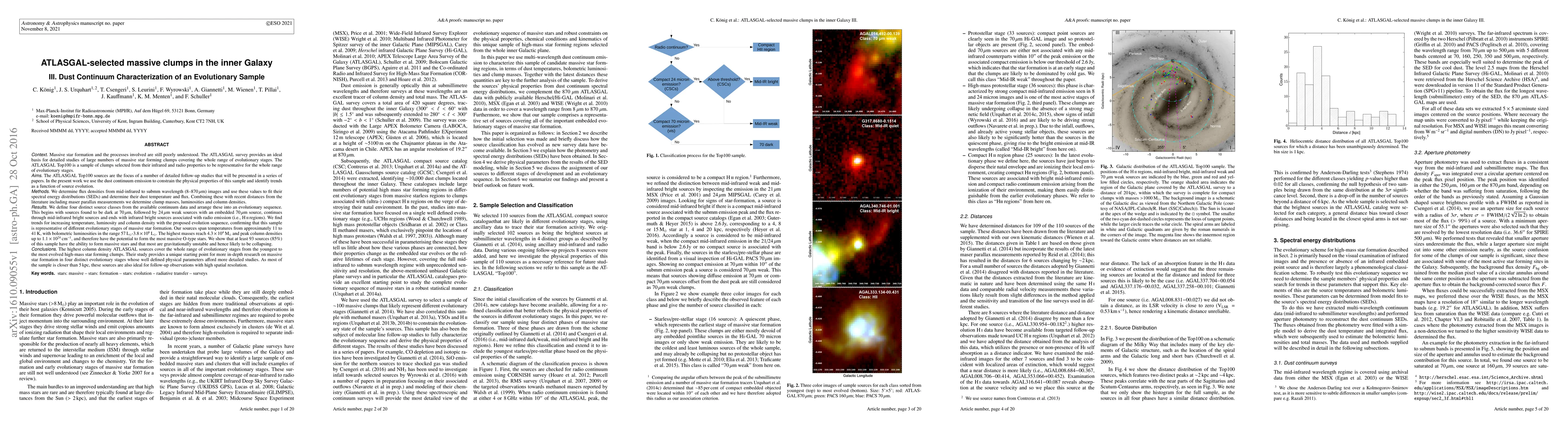 This study analyzes the dust continuum emission from ATLASGAL-selected massive star-forming clumps to determine their physical properties and evolutionary stages. The findings reveal trends of increasing temperature, luminosity, and column density with the proposed evolutionary sequence, indicating the potential for massive star formation in most clumps.