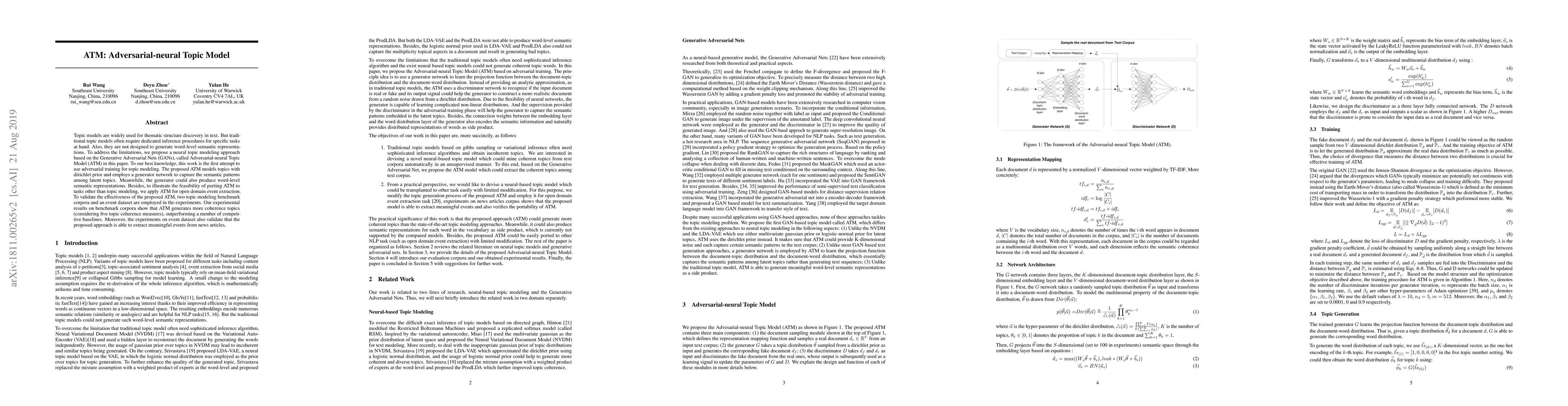 Topic models are widely used for thematic structure discovery in text. But traditional topic models often require dedicated inference procedures for specific tasks at hand. Also, they are not designed to generate word-level semantic representations. To address these limitations, we propose a topic modeling approach based on Generative Adversarial Nets (GANs), called Adversarial-neural Topic Model (ATM). The proposed ATM models topics with Dirichlet prior and employs a generator network to capture the semantic patterns among latent topics. Meanwhile, the generator could also produce word-level semantic representations. To illustrate the feasibility of porting ATM to tasks other than topic modeling, we apply ATM for open domain event extraction. Our experimental results on the two public corpora show that ATM generates more coherence topics, outperforming a number of competitive baselines. Moreover, ATM is able to extract meaningful events from news articles.