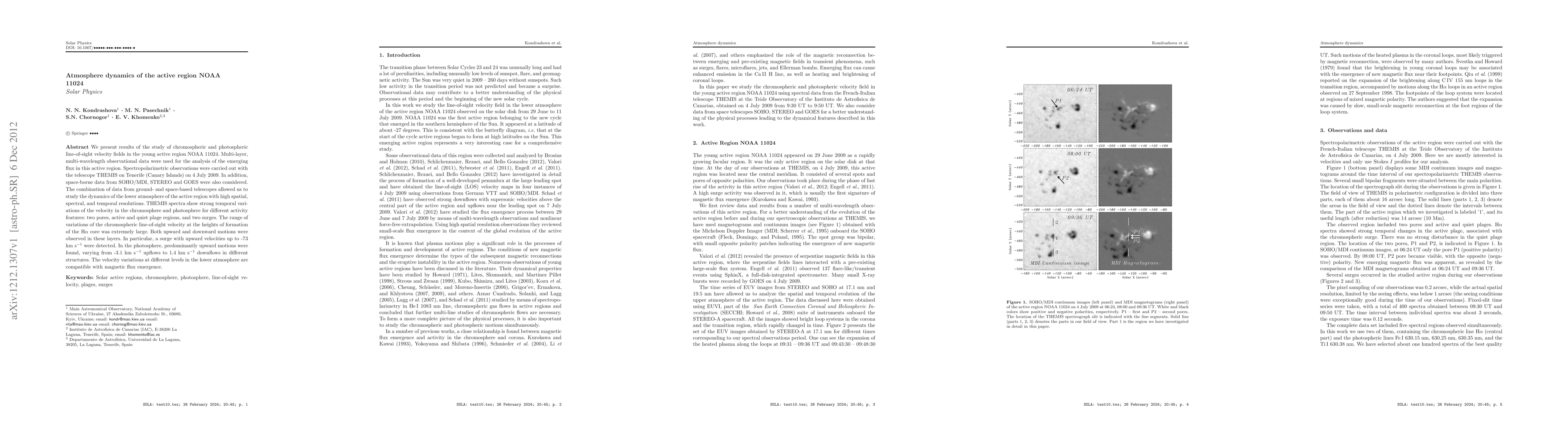 This study analyzed chromospheric and photospheric line-of-sight velocity fields in NOAA 11024 active region, finding large variations in velocity at different atmospheric heights compatible with magnetic flux emergence.