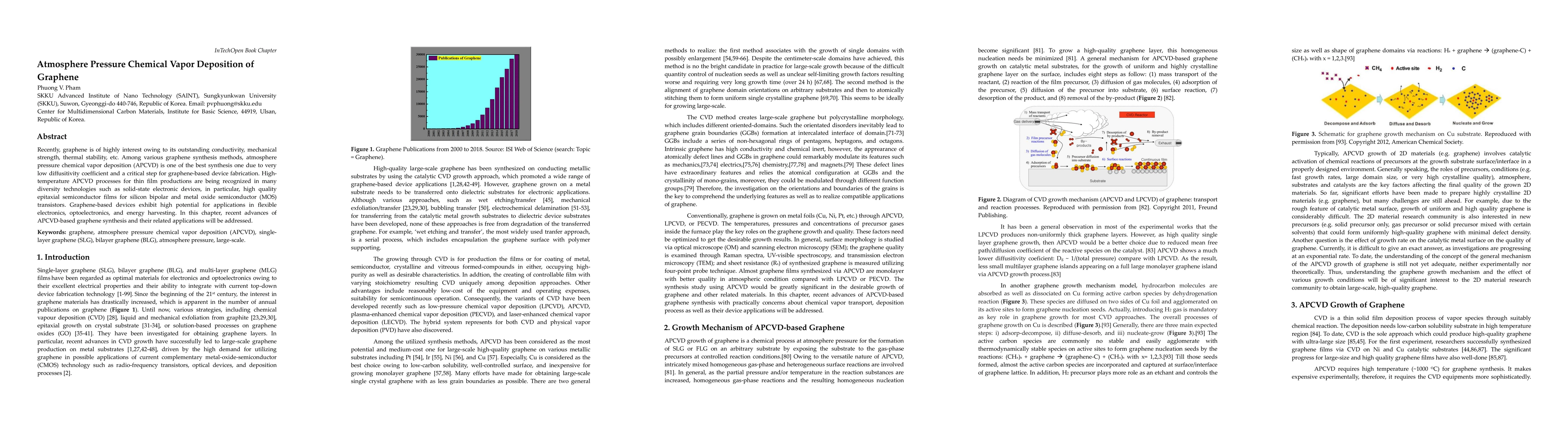 Recently, graphene is of highly interest owing to its outstanding conductivity, mechanical strength, thermal stability, etc. Among various graphene synthesis methods, atmosphere pressure chemical vapor deposition (APCVD) is one of the best synthesis one due to very low diffusitivity coefficient and a critical step for graphene-based device fabrication. High-temperature APCVD processes for thin film productions are being recognized in many diversity technologies such as solid-state electronic devices, in particular, high quality epitaxial semiconductor films for silicon bipolar and metal oxide semiconductor (MOS) transistors. Graphene-based devices exhibit high potential for applications in flexible electronics, optoelectronics, and energy harvesting. In this chapter, recent advances of APCVD-based graphene synthesis and their related applications will be addressed.