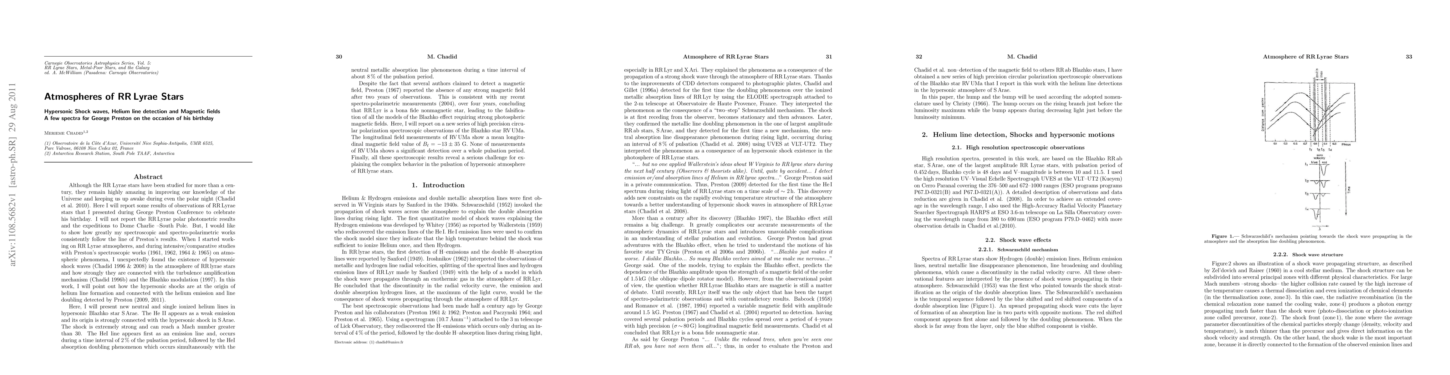During intensive/comparative studies with Preston's spectroscopic works (1961, 1962, 1964 & 1965) on RR Lyrae atmospheric phenomena, I unexpectedly found the existence of hypersonic shock waves (Chadid 1996 & 2008), that are strongly connected with the turbulence amplification mechanism (Chadid 1996b) and the Blazhko modulation (1997). Here I will show how the hypersonic shocks are at the origin of helium line formation and connected with the helium emission and line doubling detected by Preston (2009, 2011). I will present new neutral and single ionized helium line data in the hypersonic Blazhko star S Arae. The He II appears as a weak emission and its origin is strongly connected with the hypersonic shock in S Arae. The shock is extremely strong and can reach a Mach number >30. The HeI lines first appear in emission, over ~2% of the pulsation period, followed by the HeI absorption doubling phenomenon occurring simultaneously with the neutral metallic absorption line phenomenon over ~8% of the pulsation period. Despite several claimed detections of magnetic fields in RR Lyrae, Preston (1967) found none after two years of observations. This is consistent with my recent spectro-polarimetric measurements (2004), over four years, concluding that RR Lyr is a bona fide nonmagnetic star, leading to the falsification of all the models of the Blazhko effect requiring strong photospheric magnetic fields. I report on a new series of high precision circular polarization spectroscopic observations of Blazhko star RV UMa. The longitudinal field measurements of RV UMa show a mean longitudinal magnetic field of B_l = -13+/-35 G, and no significant detection over the entire pulsation cycle. These spectroscopic results reveal a serious challenge for explaining the complex behavior in the pulsation of hypersonic atmospheres of RR Lyrae stars.