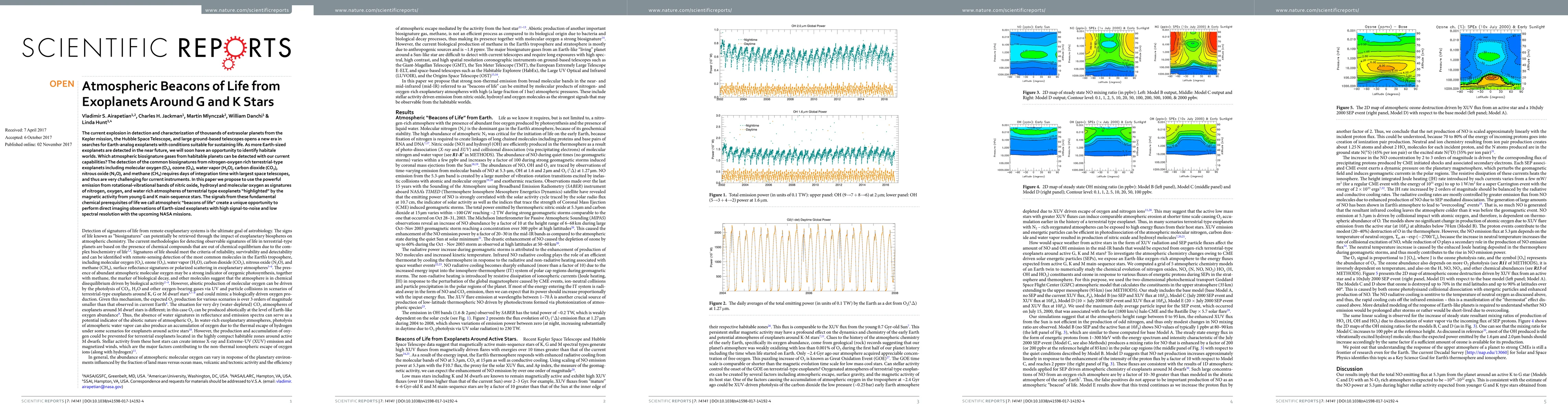 The current explosion in detection and characterization of thousands of extrasolar planets from the Kepler mission, the Hubble Space Telescope, and large ground-based telescopes opens a new era in searches for Earth-analog exoplanets with conditions suitable for sustaining life. As more Earth-sized exoplanets are detected in the near future, we will soon have an opportunity to identify habitable worlds. Which atmospheric biosignature gases from habitable planets can be detected with our current capabilities? The detection of the common biosignatures from nitrogen-oxygen rich terrestrial-type exoplanets including molecular oxygen (O2), ozone (O3), water vapor (H2O), carbon dioxide (CO2), nitrous oxide (N2O), and methane (CH4) requires days of integration time with largest space telescopes, and thus are very challenging for current instruments. In this paper we propose to use the powerful emission from rotational-vibrational bands of nitric oxide, hydroxyl and molecular oxygen as signatures of nitrogen, oxygen, and water rich atmospheres of terrestrial type exoplanets highlighted by the magnetic activity from young G and K main-sequence stars. The signals from these fundamental chemical prerequisites of life we call atmospheric beacons of life create a unique opportunity to perform direct imaging observations of Earth-sized exoplanets with high signal-to-noise and low spectral resolution with the upcoming NASA missions.