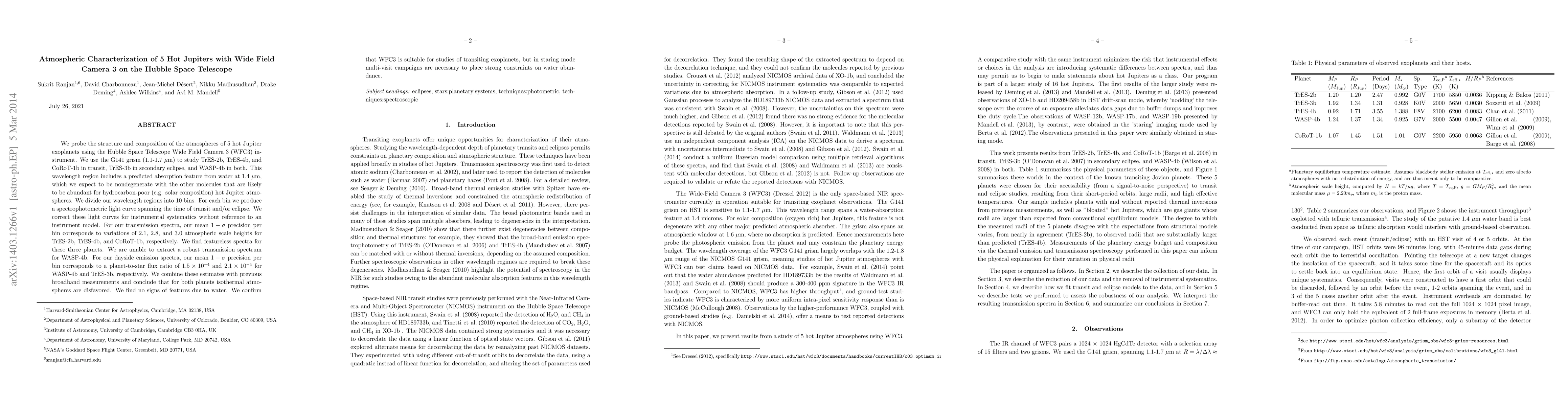 This study uses the Hubble Space Telescope's WFC3 to analyze the atmospheres of five hot Jupiters, finding featureless spectra for three and no detectable water features. Dayside emission spectra suggest non-isothermal atmospheres for two planets, highlighting the need for multi-visit campaigns to constrain water abundance.