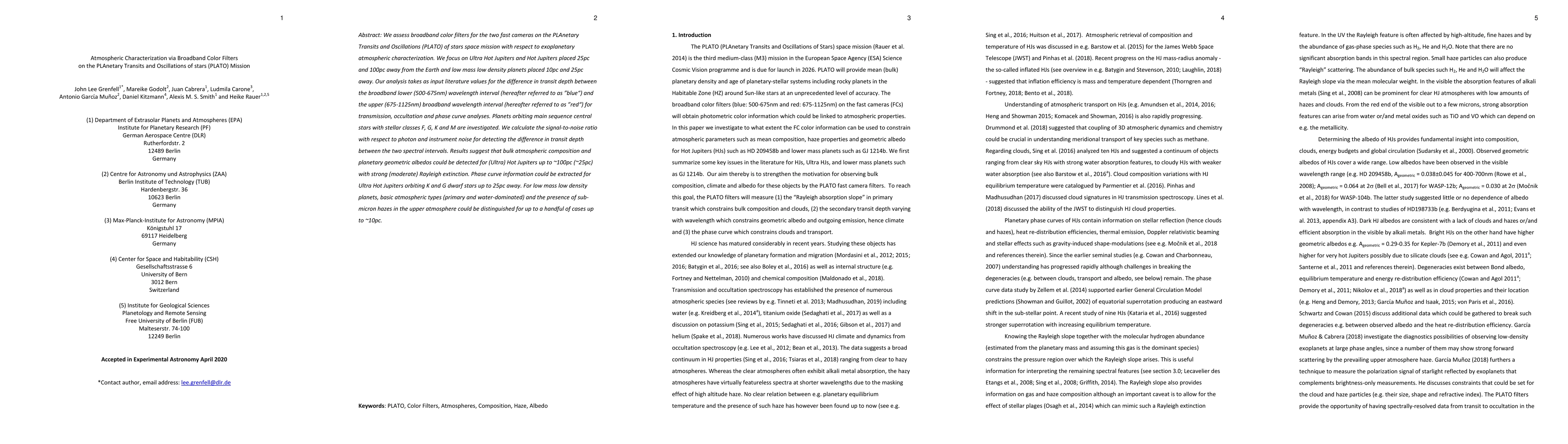 Researchers assess broadband color filters for exoplanet atmospheric characterization on the PLATO mission, finding that they can detect bulk composition and geometric albedos for Ultra Hot Jupiters up to 100pc away, and distinguish basic atmospheric types for low mass planets within 10pc.