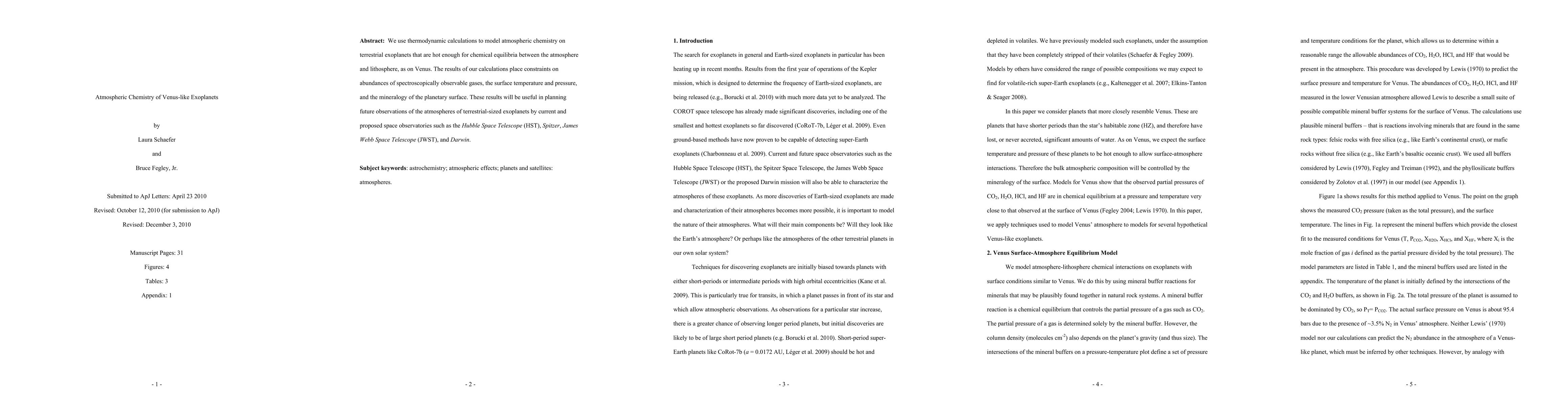 This research models atmospheric chemistry on hot, terrestrial exoplanets similar to Venus using thermodynamic calculations. It provides constraints on observable gases, surface temperature/pressure, and surface mineralogy, aiding in planning future observations by various space telescopes.