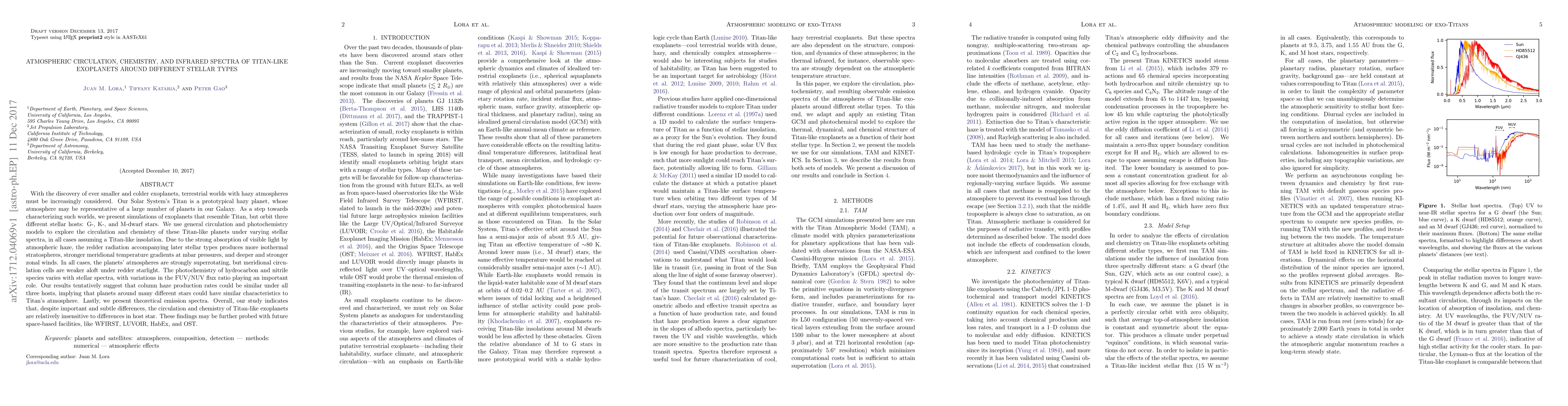 This study simulates the atmospheric circulation, chemistry, and infrared spectra of Titan-like exoplanets orbiting G-, K-, and M-dwarf stars, revealing that despite differences in stellar spectra, the atmospheres exhibit strong superrotation and similar circulation patterns. The research suggests that Titan-like exoplanets may have similar atmospheric characteristics regardless of their host star type.