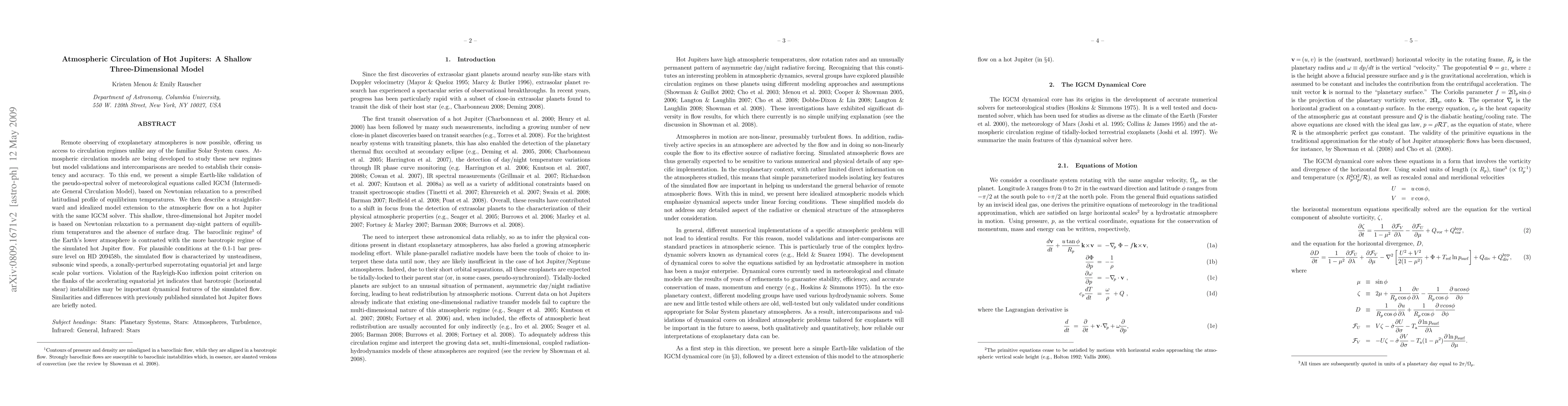 This paper presents a shallow three-dimensional model of atmospheric circulation on hot Jupiters using the IGCM solver, contrasting its dynamics with Earth's baroclinic regime. The model reveals unsteadiness, subsonic winds, and a superrotating equatorial jet on HD 209458b, suggesting barotropic instabilities may play a significant role.