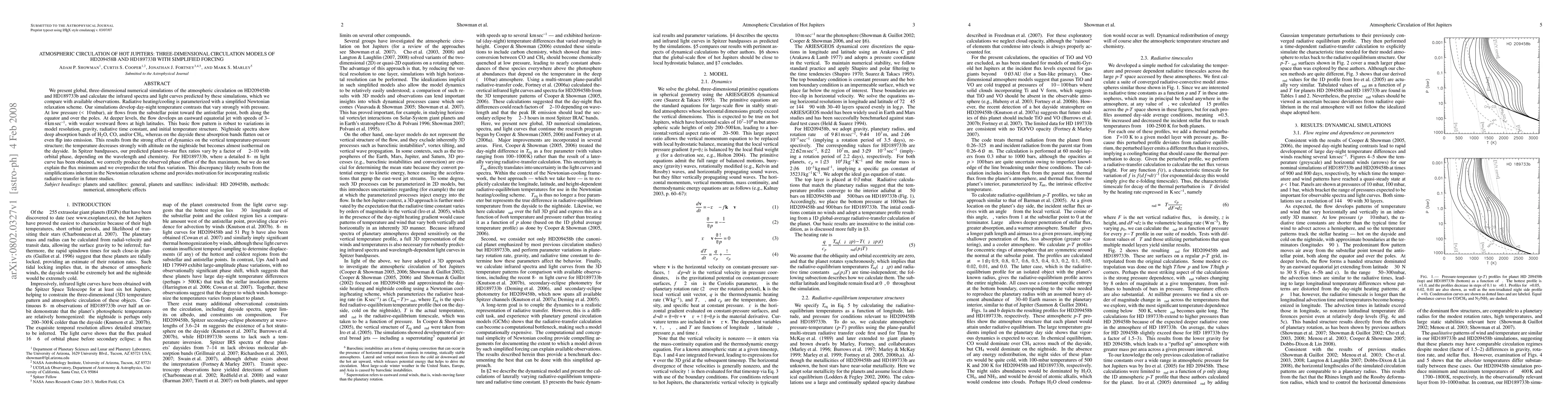 We present global, three-dimensional numerical simulations of the atmospheric circulation on HD 209458b and HD 189733b and calculate the infrared spectra and light curves predicted by these simulations, which we compare with available observations. Radiative heating/cooling is parameterized with a simplified Newtonian relaxation scheme. Our simulations develop day-night temperature contrasts that vary strongly with pressure. At low pressure (<10 mbar), air flows from the substellar point toward the antistellar point, both along the equator and over the poles. At deeper levels, the flow develops an eastward equatorial jet with speeds of 3-4 km/sec, with weaker westward flows at high latitudes. This basic flow pattern is robust to variations in model resolution, gravity, radiative time constant, and initial temperature structure. Nightside spectra show deep absorption bands of H2O, CO, and/or CH4, whereas on the dayside these absorption bands flatten out or even flip into emission. This results from the strong effect of dynamics on the vertical temperature-pressure structure; the temperature decreases strongly with altitude on the nightside but becomes almost isothermal on the dayside. In Spitzer bandpasses, our predicted planet-to-star flux ratios vary by a factor of 2-10 with orbital phase, depending on the wavelength and chemistry. For HD 189733b, where a detailed 8-micron light curve has been obtained, we correctly produce the observed phase offset of the flux maximum, but we do not explain the flux minimum and we overpredict the total flux variation. This discrepancy likely results from the simplifications inherent in the Newtonian relaxation scheme and provides motivation for incorporating realistic radiative transfer in future studies.