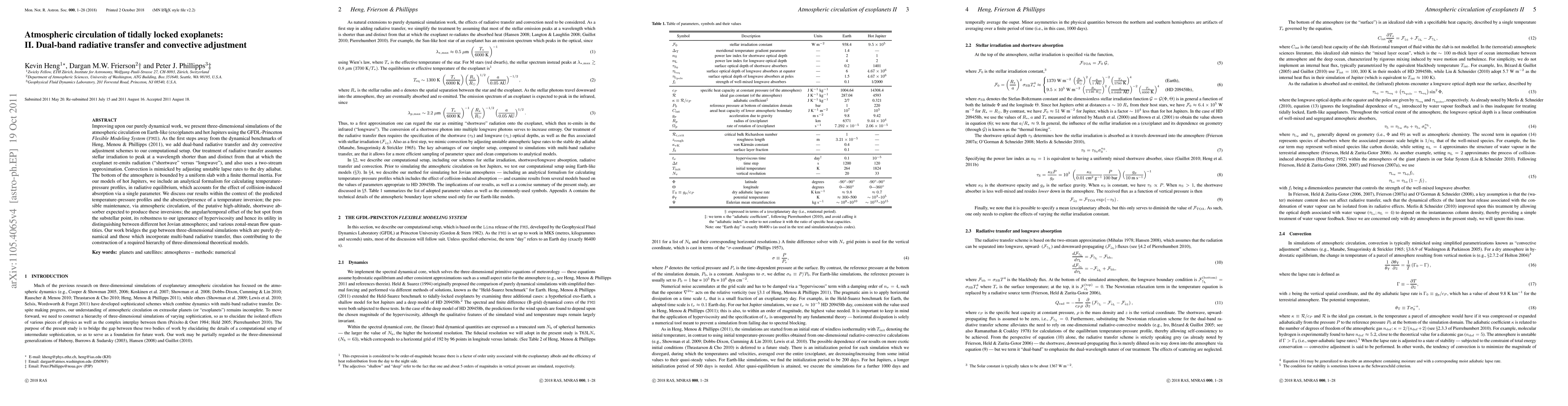 Improving upon our purely dynamical work, we present three-dimensional simulations of the atmospheric circulation on Earth-like (exo)planets and hot Jupiters using the GFDL-Princeton Flexible Modeling System (FMS). As the first steps away from the dynamical benchmarks of Heng, Menou & Phillipps (2011), we add dual-band radiative transfer and dry convective adjustment schemes to our computational setup. Our treatment of radiative transfer assumes stellar irradiation to peak at a wavelength shorter than and distinct from that at which the exoplanet re-emits radiation ("shortwave" versus "longwave"), and also uses a two-stream approximation. Convection is mimicked by adjusting unstable lapse rates to the dry adiabat. The bottom of the atmosphere is bounded by a uniform slab with a finite thermal inertia. For our models of hot Jupiters, we include an analytical formalism for calculating temperature-pressure profiles, in radiative equilibrium, which accounts for the effect of collision-induced absorption via a single parameter. We discuss our results within the context of: the predicted temperature-pressure profiles and the absence/presence of a temperature inversion; the possible maintenance, via atmospheric circulation, of the putative high-altitude, shortwave absorber expected to produce these inversions; the angular/temporal offset of the hot spot from the substellar point, its robustness to our ignorance of hyperviscosity and hence its utility in distinguishing between different hot Jovian atmospheres; and various zonal-mean flow quantities. Our work bridges the gap between three-dimensional simulations which are purely dynamical and those which incorporate multi-band radiative transfer, thus contributing to the construction of a required hierarchy of three-dimensional theoretical models.
