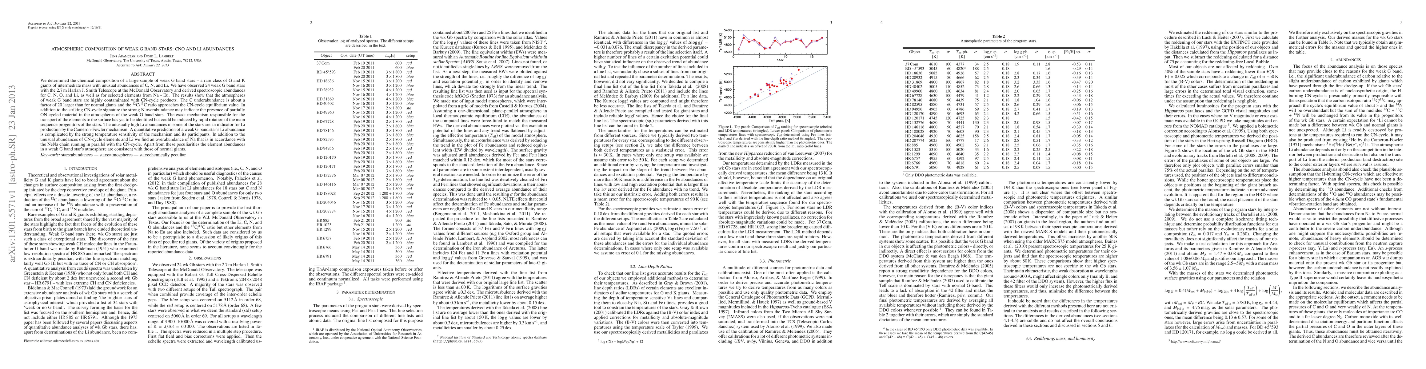 We determined the chemical composition of a large sample of weak G band stars -- a rare class of G and K giants of intermediate mass with unusual abundances of C, N, and Li. We have observed 24 weak G band stars with the 2.7 m Harlan J. Smith Telescope at the McDonald Observatory and derived spectroscopic abundances for C, N, O, and Li, as well as for selected elements from Na - Eu. The results show that the atmospheres of weak G band stars are highly contaminated with CN-cycle products. The C underabundance is about a factor of 20 larger than for normal giants and the $^{12}$C/$^{13}$C ratio approaches the CN-cycle equilibrium value. In addition to the striking CN-cycle signature the strong N overabundance may indicate the presence of partially ON-cycled material in the atmospheres of the weak G band stars. The exact mechanism responsible for the transport of the elements to the surface has yet to be identified but could be induced by rapid rotation of the main sequence progenitors of the stars. The unusually high Li abundances in some of the stars are an indicator for Li production by the Cameron-Fowler mechanism. A quantitative prediction of a weak G band star's Li abundance is complicated by the strong temperature sensitivity of the mechanism and its participants. In addition to the unusual abundances of CN-cycle elements and Li we find an overabundance of Na that is in accordance with the NeNa chain running in parallel with the CN-cycle. Apart from these peculiarities the element abundances in a weak G band star's atmosphere are consistent with those of normal giants.