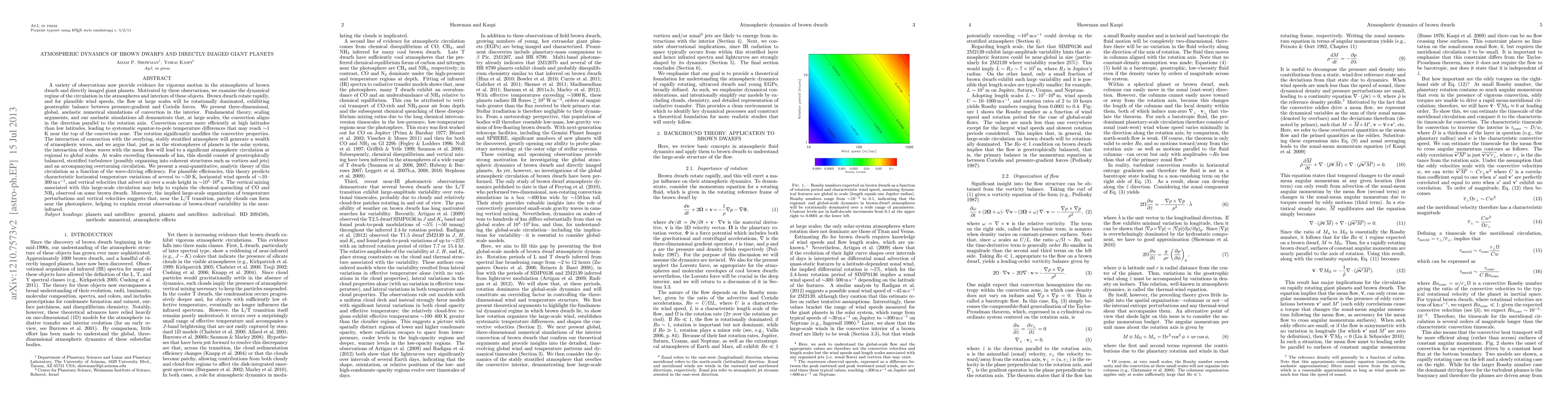 This paper investigates the atmospheric dynamics of brown dwarfs and directly imaged giant planets, showing that rapid rotation and convection lead to significant atmospheric circulation and stratified turbulence. The study predicts large-scale temperature variations and wind speeds, which may explain chemical disequilibrium and variability in brown dwarfs.