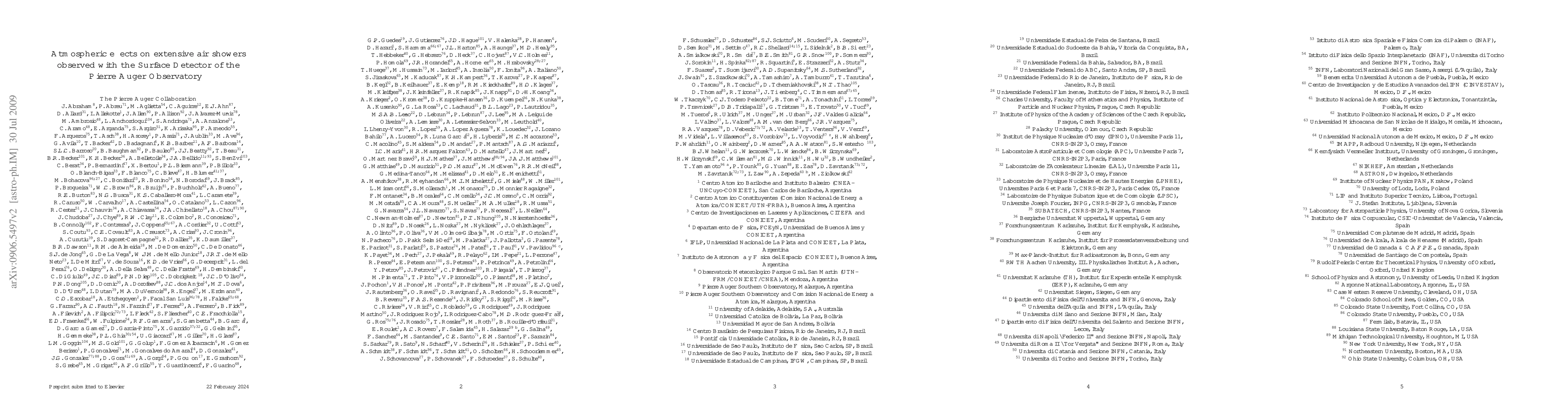This paper investigates how atmospheric parameters like pressure and density influence extensive air showers detected by the Pierre Auger Observatory's surface detector. The study finds a ~10% seasonal and ~2% diurnal modulation in event rates, which is well explained by a model incorporating pressure and density variations, validated through full simulations.
