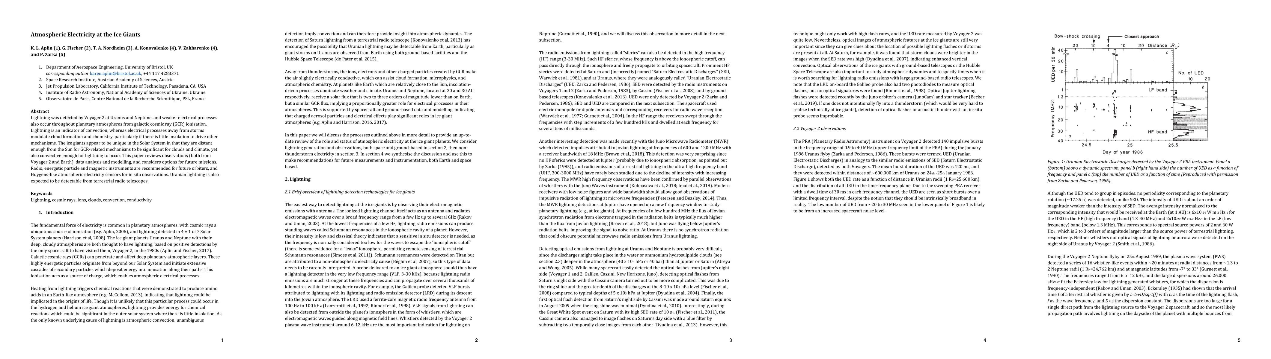 Lightning was detected by Voyager 2 at Uranus and Neptune, and weaker electrical processes also occur throughout planetary atmospheres from galactic cosmic ray (GCR) ionisation. Lightning is an indicator of convection, whereas electrical processes away from storms modulate cloud formation and chemistry, particularly if there is little insolation to drive other mechanisms. The ice giants appear to be unique in the Solar System in that they are distant enough from the Sun for GCR-related mechanisms to be significant for clouds and climate, yet also convective enough for lightning to occur. This paper reviews observations (both from Voyager 2 and Earth), data analysis and modelling, and considers options for future missions. Radio, energetic particle and magnetic instruments are recommended for future orbiters, and Huygens-like atmospheric electricity sensors for in situ observations. Uranian lightning is also expected to be detectable from terrestrial radio telescopes.