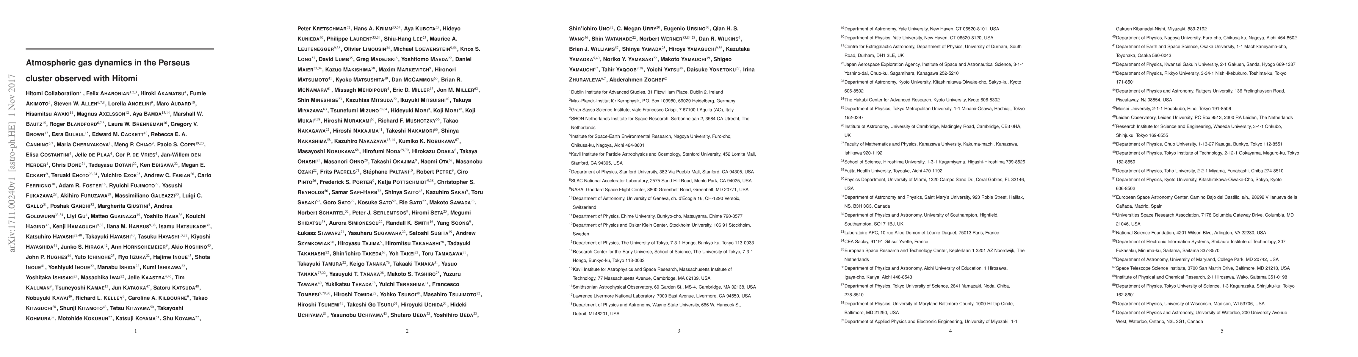 This paper reports on atmospheric gas dynamics in the Perseus cluster using Hitomi satellite observations, finding low and uniform line-of-sight velocity dispersions, a velocity gradient across the cluster core, and consistent ion and electron temperatures. The study also measures the redshift of the brightest cluster galaxy NGC~1275.