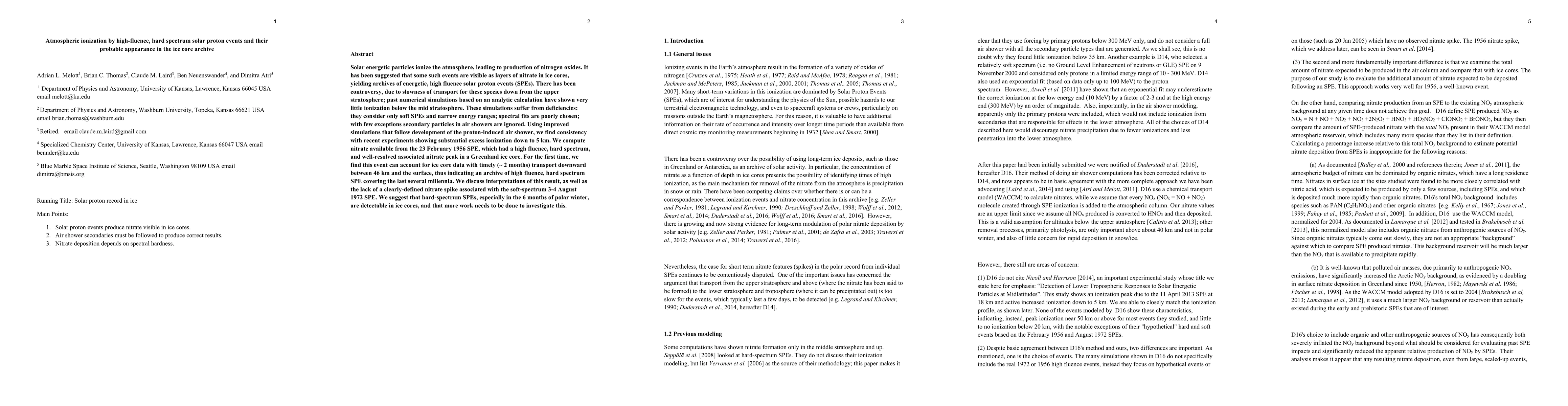 This paper uses improved simulations to show that high-fluence, hard spectrum solar proton events (SPEs) can ionize the atmosphere sufficiently to leave a nitrate signature in ice cores, resolving past simulation discrepancies. The study finds that the 1956 SPE, with a hard spectrum, can account for observed nitrate peaks, suggesting a potential archive of such events in ice cores over millennia.