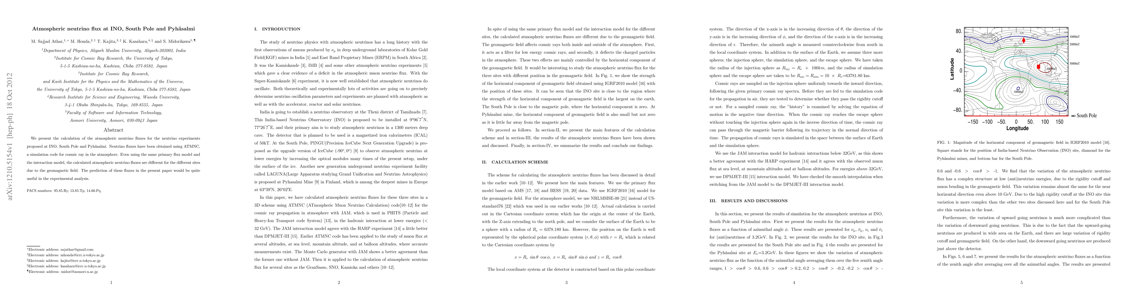 This paper calculates atmospheric neutrino fluxes for proposed experiments at INO, South Pole, and Pyhäsalmi using the ATMNC simulation code. Differences in fluxes are attributed to the geomagnetic field variations at each site, providing crucial predictions for experimental analysis.