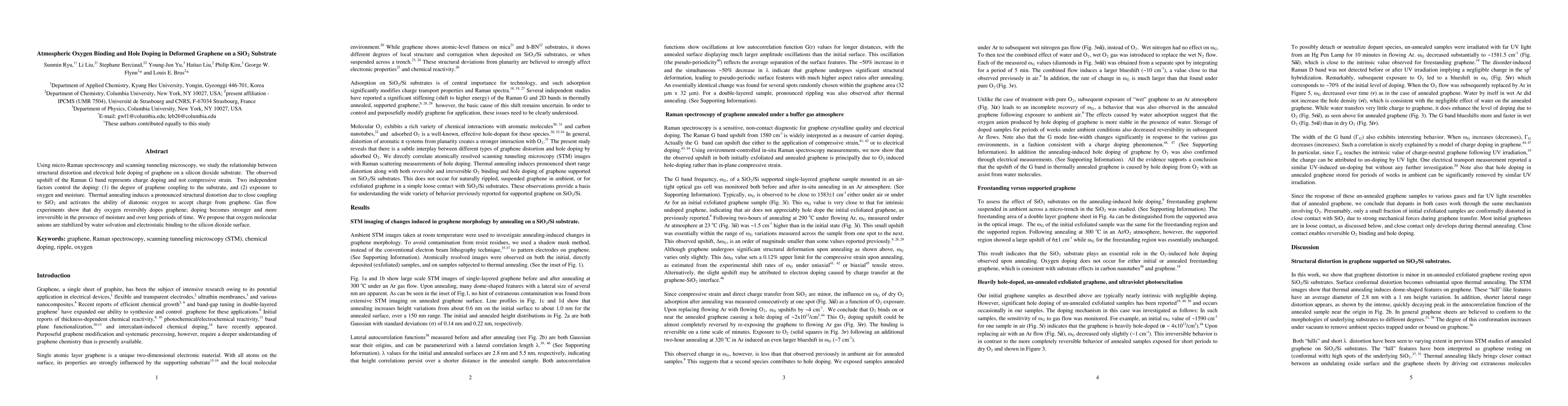 Using micro-Raman spectroscopy and scanning tunneling microscopy, we study the relationship between structural distortion and electrical hole doping of graphene on a silicon dioxide substrate. The observed upshift of the Raman G band represents charge doping and not compressive strain. Two independent factors control the doping: (1) the degree of graphene coupling to the substrate, and (2) exposure to oxygen and moisture. Thermal annealing induces a pronounced structural distortion due to close coupling to SiO2 and activates the ability of diatomic oxygen to accept charge from graphene. Gas flow experiments show that dry oxygen reversibly dopes graphene; doping becomes stronger and more irreversible in the presence of moisture and over long periods of time. We propose that oxygen molecular anions are stabilized by water solvation and electrostatic binding to the silicon dioxide surface.