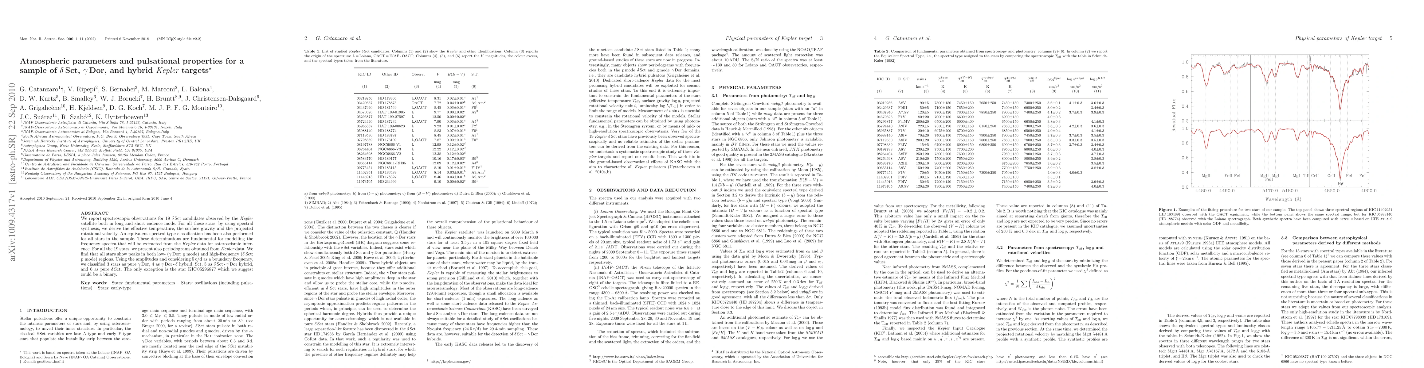 This paper reports spectroscopic observations of 19 stars observed by the Kepler satellite, deriving effective temperature, surface gravity, and projected rotational velocity for each. It classifies the stars into $\delta$\,Sct, $\gamma$\,Dor, and hybrid types based on pulsational properties, finding 3 pure $\gamma$\,Dor, 4 hybrid, 5 hybrid, and 6 pure $\delta$\,Sct stars, with one potential binary.