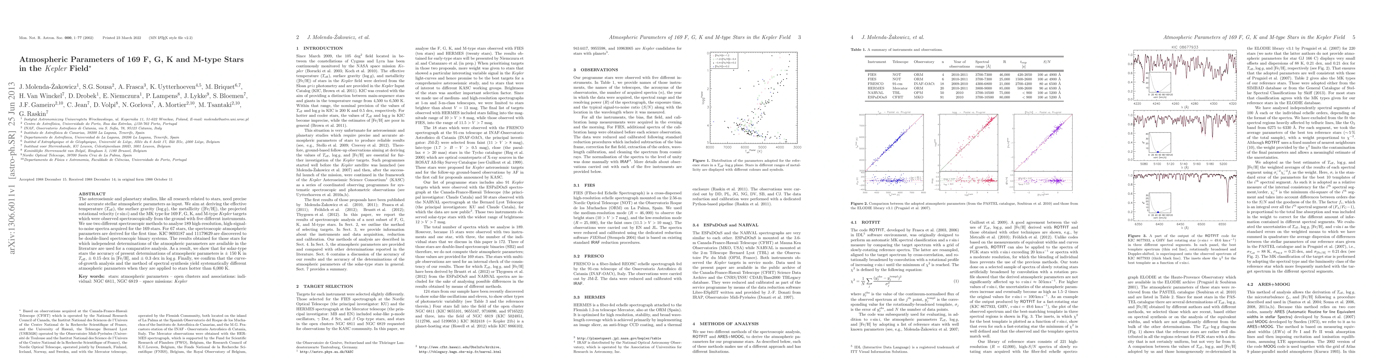 This study derives atmospheric parameters for 169 F, G, K, and M-type stars observed in the Kepler field using spectroscopic methods. The results show an accuracy of +/- 150 K in effective temperature, +/- 0.15 dex in metallicity, and +/- 0.3 dex in surface gravity for solar-type stars, while highlighting systematic differences in parameter determinations for hotter stars.