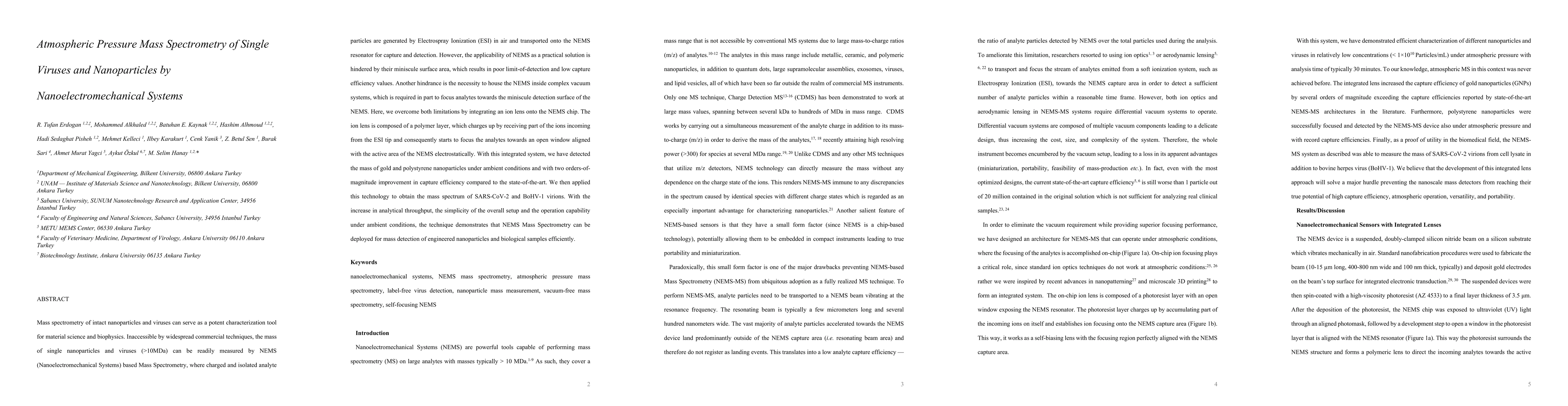 This paper presents a novel NEMS-based mass spectrometry technique for characterizing single nanoparticles and viruses, overcoming limitations of previous methods by integrating an ion lens to enhance capture efficiency and eliminate the need for vacuum systems. The method successfully detects the mass of nanoparticles and viruses under ambient conditions, showing significant improvements in efficiency and applicability.