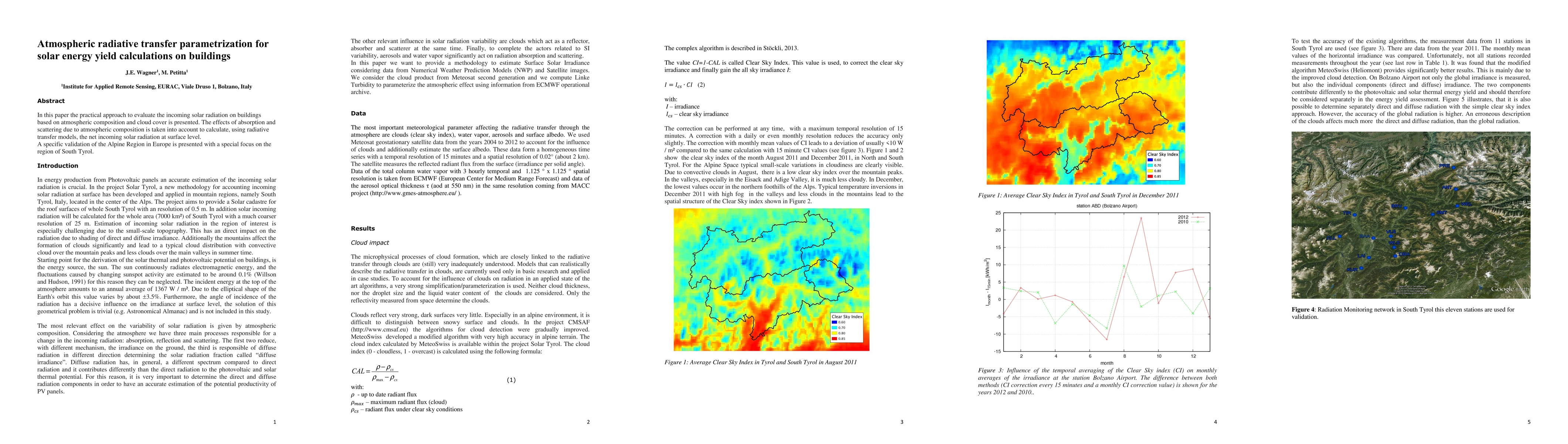 In this paper the practical approach to evaluate the incoming solar radiation on buildings based on atmospheric composition and cloud cover is presented. The effects of absorption and scattering due to atmospheric composition is taken into account to calculate, using radiative transfer models, the net incoming solar radiation at surface level. A specific validation of the Alpine Region in Europe is presented with a special focus on the region of South Tyrol.