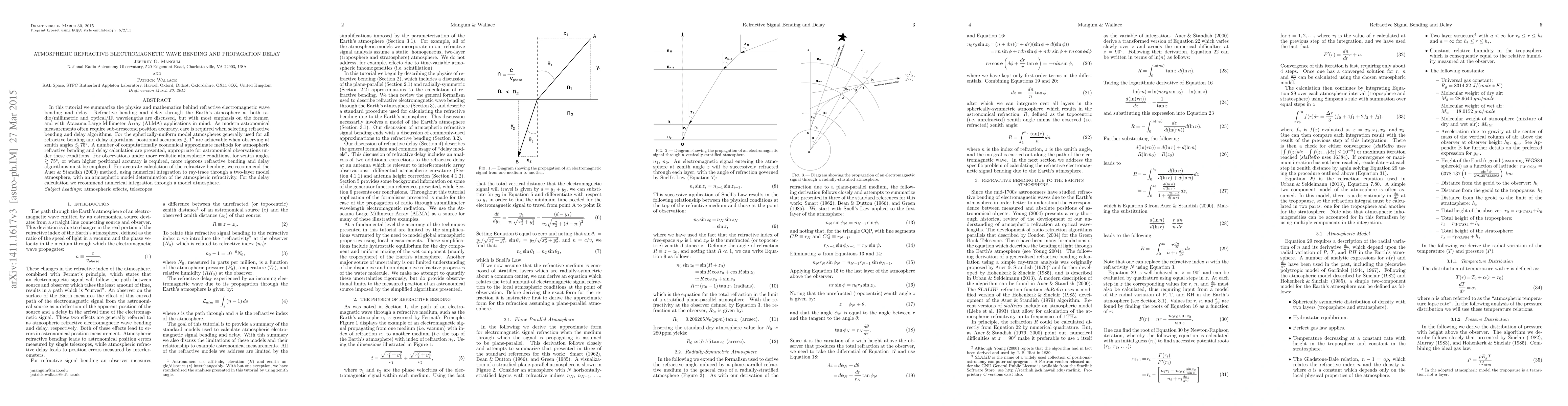 In this tutorial we summarize the physics and mathematics behind refractive electromagnetic wave bending and delay. Refractive bending and delay through the Earth's atmosphere at both radio/millimetric and optical/IR wavelengths are discussed, but with most emphasis on the former, and with Atacama Large Millimeter Array (ALMA) applications in mind. As modern astronomical measurements often require sub-arcsecond position accuracy, care is required when selecting refractive bending and delay algorithms. For the spherically-uniform model atmospheres generally used for all refractive bending and delay algorithms, positional accuracies $\lesssim 1^{\prime\prime}$ are achievable when observing at zenith angles $\lesssim 75^\circ$. A number of computationally economical approximate methods for atmospheric refractive bending and delay calculation are presented, appropriate for astronomical observations under these conditions. For observations under more realistic atmospheric conditions, for zenith angles $\gtrsim 75^\circ$, or when higher positional accuracy is required, more rigorous refractive bending and delay algorithms must be employed. For accurate calculation of the refractive bending, we recommend the Auer & Standish (2000) method, using numerical integration to ray-trace through a two-layer model atmosphere, with an atmospheric model determination of the atmospheric refractivity. For the delay calculation we recommend numerical integration through a model atmosphere.