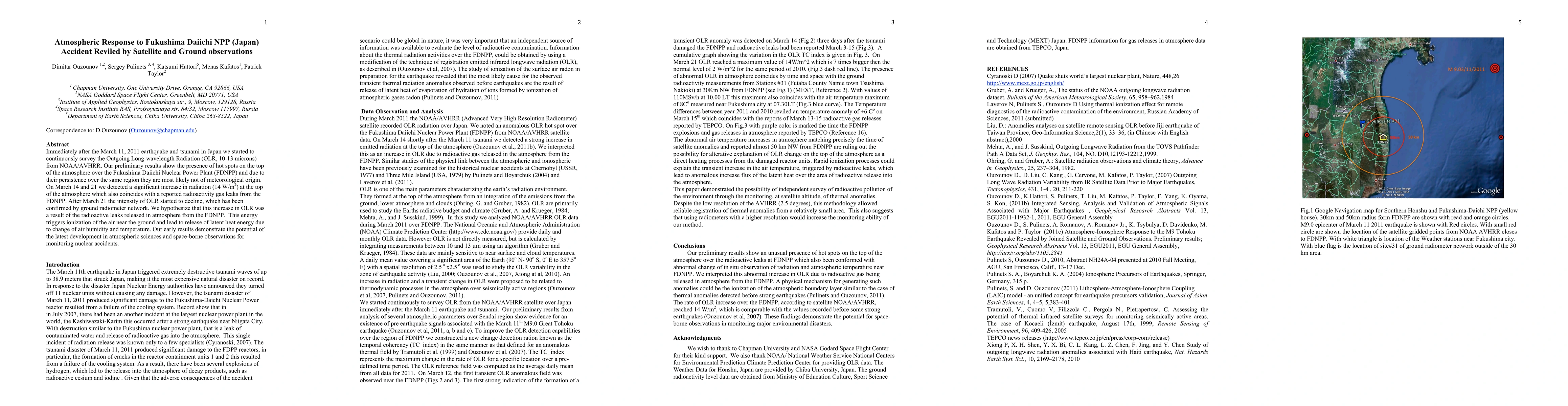 Immediately after the March 11, 2011 earthquake and tsunami in Japan we started to continuously survey the Outgoing Long-wavelength Radiation (OLR, 10-13 microns) from NOAA/AVHRR. Our preliminary results show the presence of hot spots on the top of the atmosphere over the Fukushima Daiichi Nuclear Power Plant (FDNPP) and due to their persistence over the same region they are most likely not of meteorological origin. On March 14 and 21 we detected a significant increase in radiation (14 W/m2) at the top of the atmosphere which also coincides with a reported radioactivity gas leaks from the FDNPP. After March 21 the intensity of OLR started to decline, which has been confirmed by ground radiometer network. We hypothesize that this increase in OLR was a result of the radioactive leaks released in atmosphere from the FDNPP. This energy triggers ionization of the air near the ground and lead to release of latent heat energy due to change of air humidity and temperature. Our early results demonstrate the potential of the latest development in atmospheric sciences and space-borne observations for monitoring nuclear accidents.