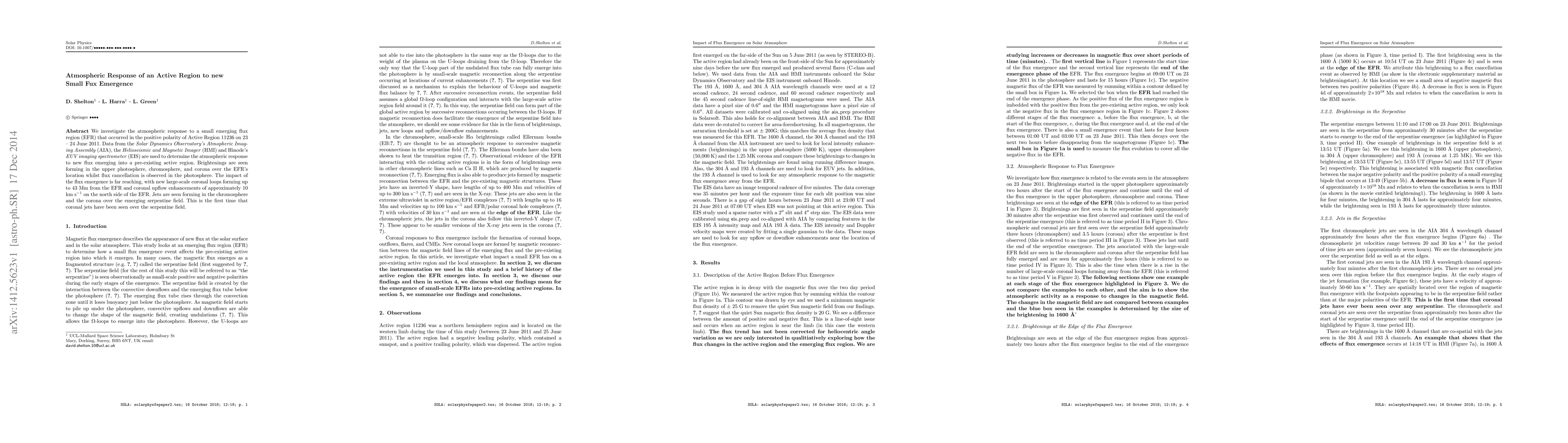 We investigate the atmospheric response to a small emerging flux region (EFR) that occurred in the positive polarity of Active Region 11236 on 23 \,-\ 24 June 2011. Data from the \textit{Solar Dynamics Observatory's Atmopheric Imaging Assembly} (AIA), the \textit{Helioseismic and Magnetic Imager} (HMI) and Hinode's \textit{EUV imaging spectrometer} (EIS) are used to determine the atmospheric response to new flux emerging into a pre-existing active region. Brightenings are seen forming in the upper photosphere, chromosphere, and corona over the EFR's location whilst flux cancellation is observed in the photosphere. The impact of the flux emergence is far reaching, with new large-scale coronal loops forming up to 43 Mm from the EFR and coronal upflow enhancements of approximately 10 km s$^{-1}$ on the north side of the EFR. Jets are seen forming in the chromosphere and the corona over the emerging serpentine field. This is the first time that coronal jets have been seen over the serpentine field.