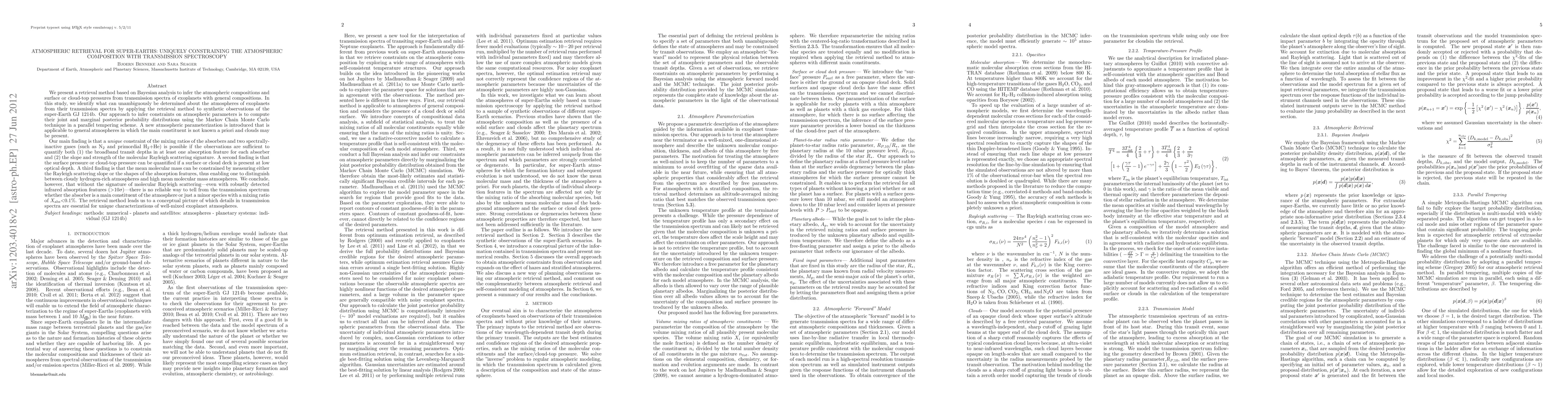 This paper introduces a Bayesian retrieval method for determining exoplanet atmospheric compositions, particularly for super-Earths like GJ 1214b. Utilizing MCMC and parallel tempering, it finds that unique constraints on mixing ratios of absorbers and two inactive gases, along with surface/cloud-top pressure, are possible with broadband transit depth data and Rayleigh scattering signature. Without Rayleigh scattering, distinguishing between major and minor atmospheric species remains unreliable.